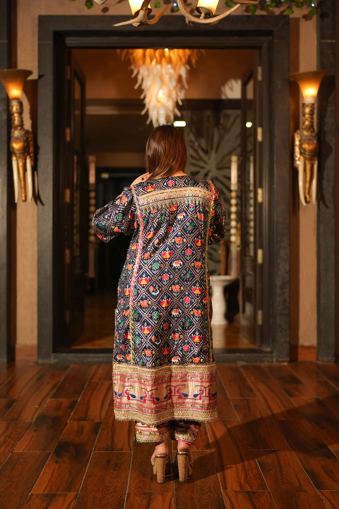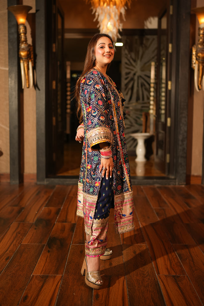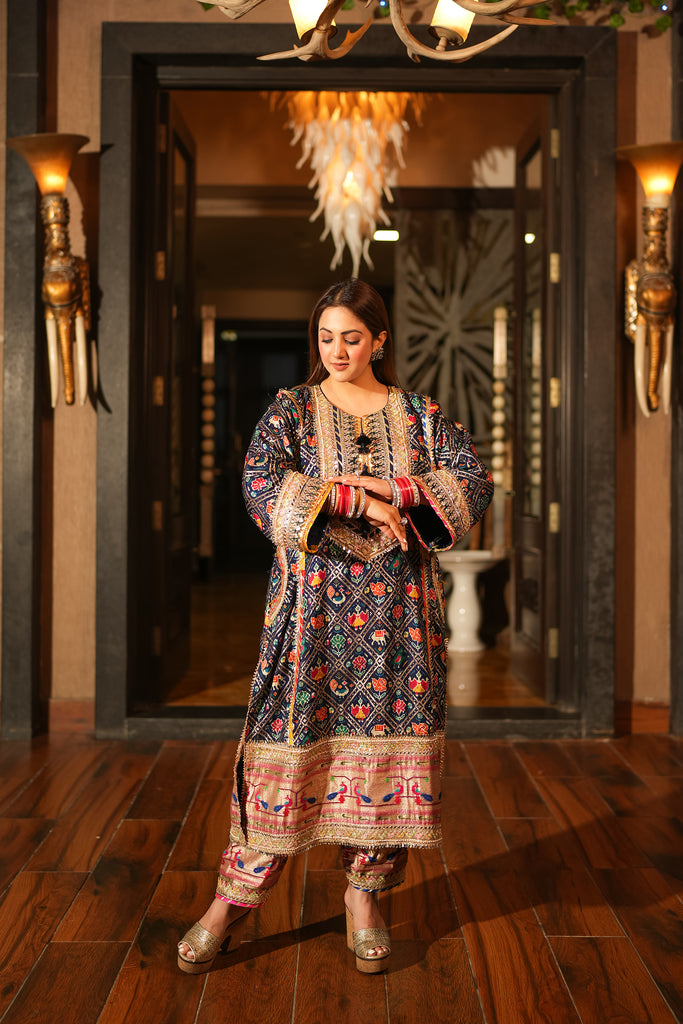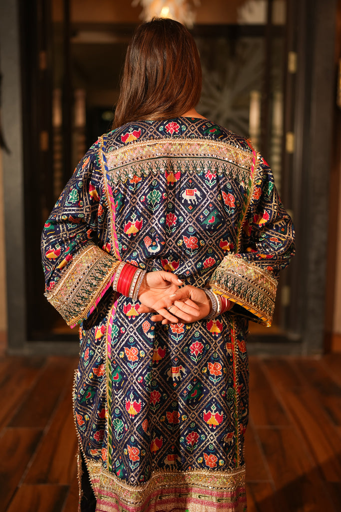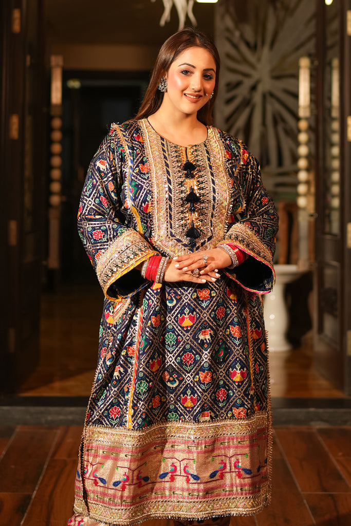 This Blue Peacock Patola Silk two piece set embodies traditional elegance. The rich embroidery and vibrant colours add a regal touch while the afghani salwar and the intricate detailing creates a perfect balance of comfort, classy, chic and stylish.This peacock embroidery adds an elegant and regal touch giving it a graceful appeal.