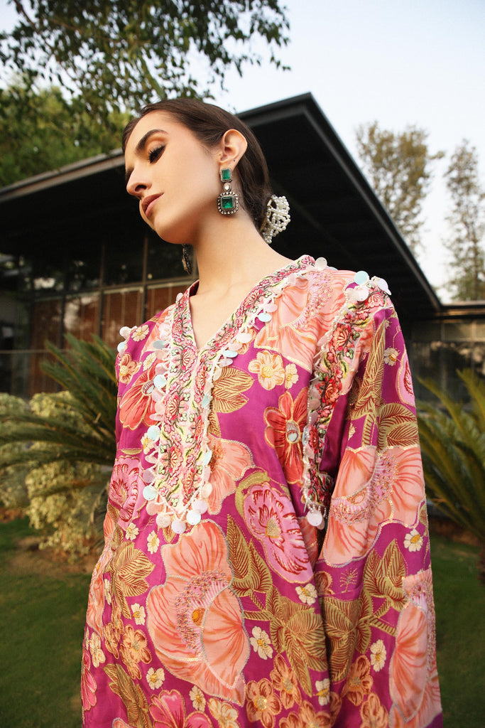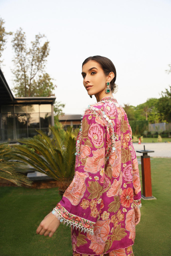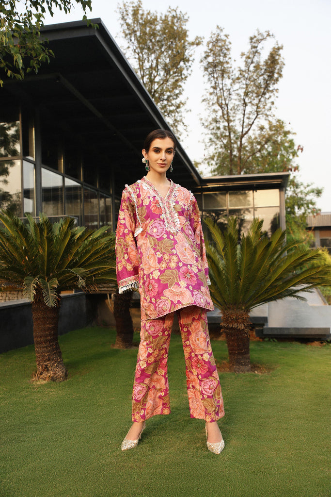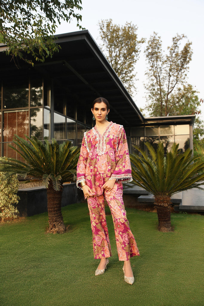 The combination used in this co-ord set of floral patterns, sequins and pearl like tassell evoke the beauty of a blooming garden. This two piece floral outfits consists of long oversized shirt with comfortable trouser like pants and has details of pearl like tassell on the neck, the shoulder, the armhole and the sleeve ends. A subtle hint of floral embroidery or an all-over print, the floral details add a touch of femininity and elegance to the co-ord set.