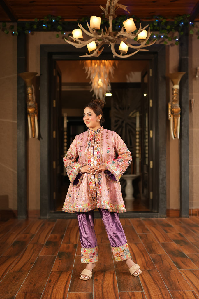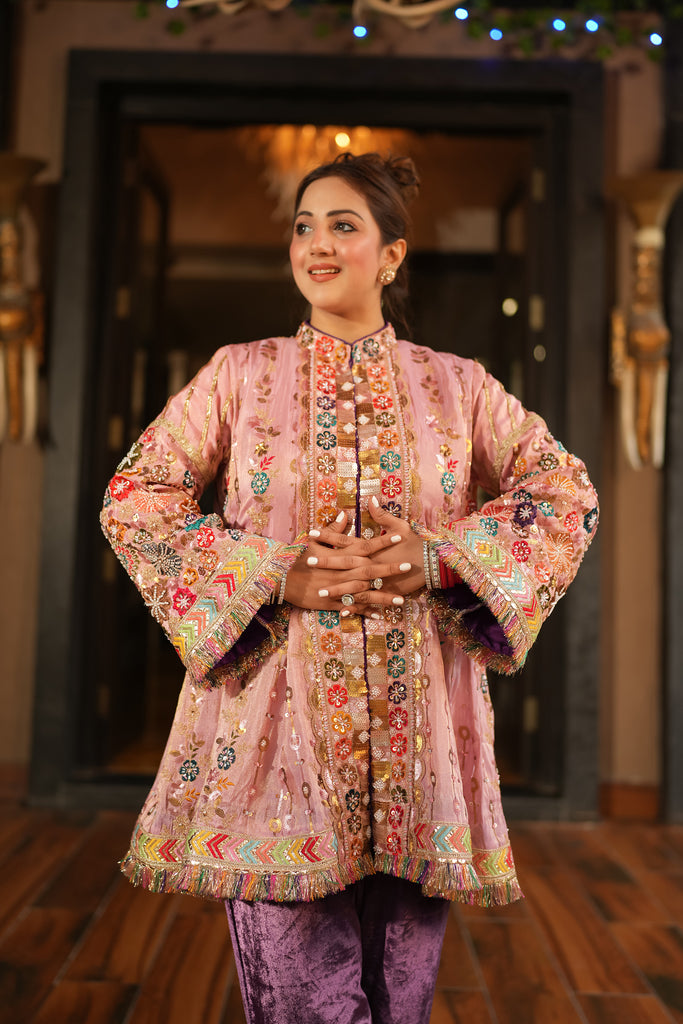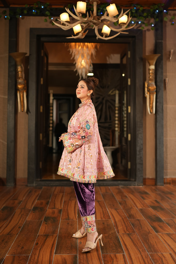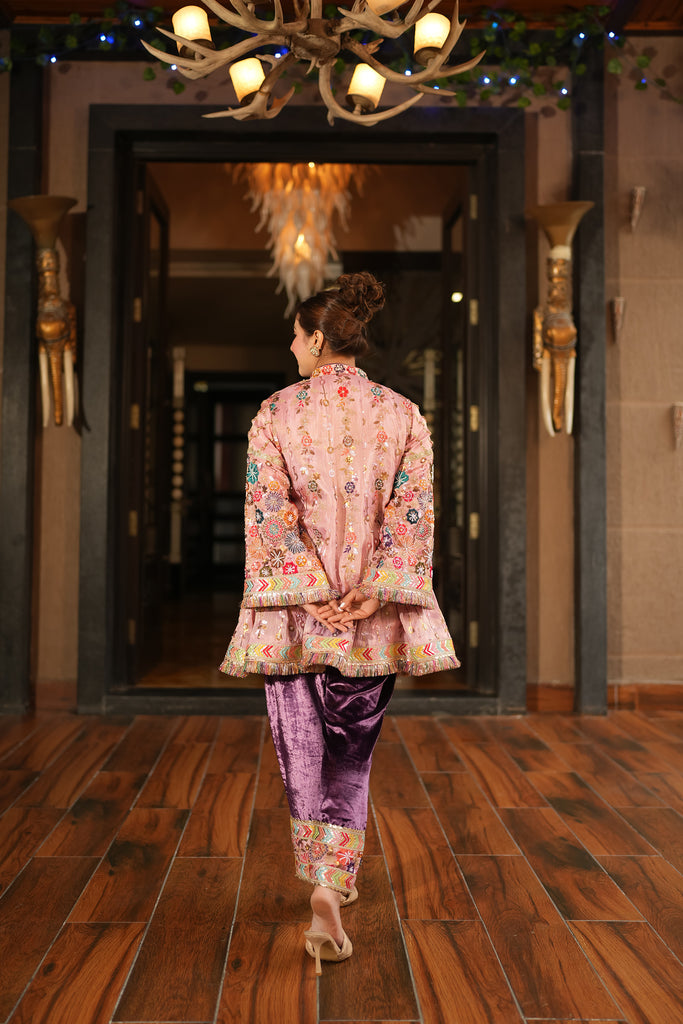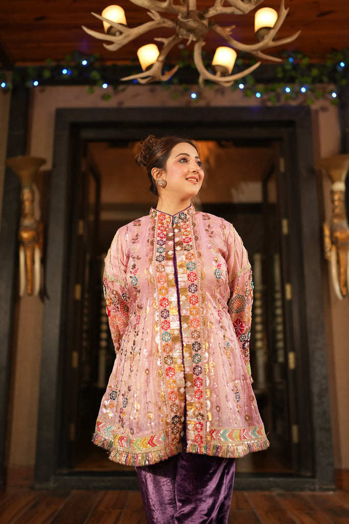 The pink a-line angrakha style shirt when paired with a contact violet coloured afghani salwar just adds a bold and stunning color contrast. The angrakha silhouette, with its flattering cut and traditional flair paired with a violet Afghani salwar would bring in some added drama with its volume and flow, balancing the sharpness of the pink shirt. The beautiful multicolour sequence, thread and pearl work along with the multicolour tassels used enhances the richness and adds more light to the garment making it a perfect outfit for any festivities.