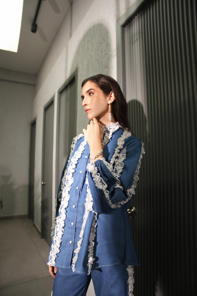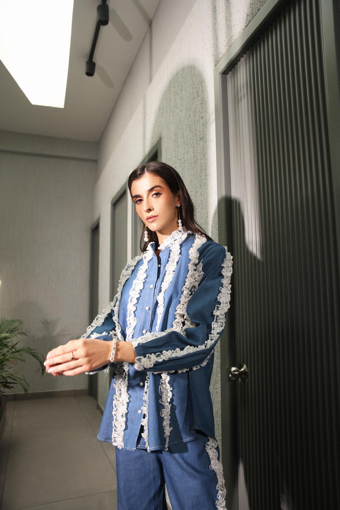 This denim ruffle set combines the rugged charm of denim with the playful elegance of ruffles. The ruffles add a feminine and whimsical touch to the classic denim fabric, creating a look that's both chic and fun. The ruffles are patterned all over the skirt, on the collar and the sides of the pants.