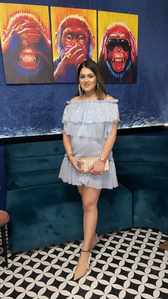 Ice blue off shoulder tripled ruffled layered dress short above the knee length dress with ankle length sleeves. This chic elegant dress is perfect for any date night or any formal party occasion.