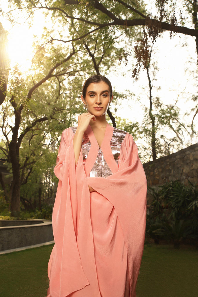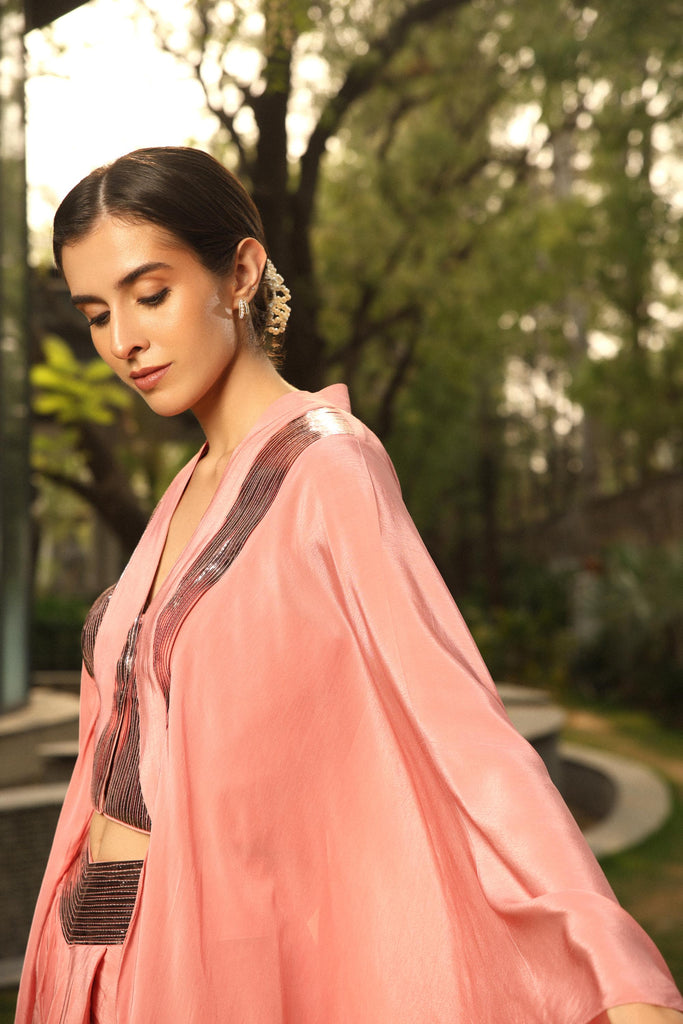 This 2 piece set combines the soft, romantic hue of blush pink with the shimmer and shine of metallic foil work detailing creating a captivating and glamorous look. The short length top has dramatic long sleeves and metallic foil detailing on the neck, armhole and the front of the top, paired with a dhoti front open modern skirt with foil metallic detailing on the waist of the skirt. The metallic detailing brings a sense of luxury and sophistication and makes this outfit versatile for any wedding function, cocktail or any formal party.