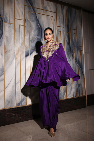 This regal purple set features a flowing dhoti skirt crafted from pure crepe, adorned with intricate zari and sequin embroidery in floral patterns along the waistband and hem. The matching kurta showcases detailed thread work and embellishments on the neckline and flared sleeves, complemented by a sheer dupatta with embroidered borders. Perfect for festive occasions or evening events, blending tradition with modern elegance.