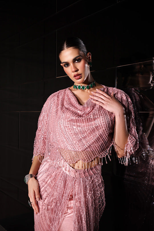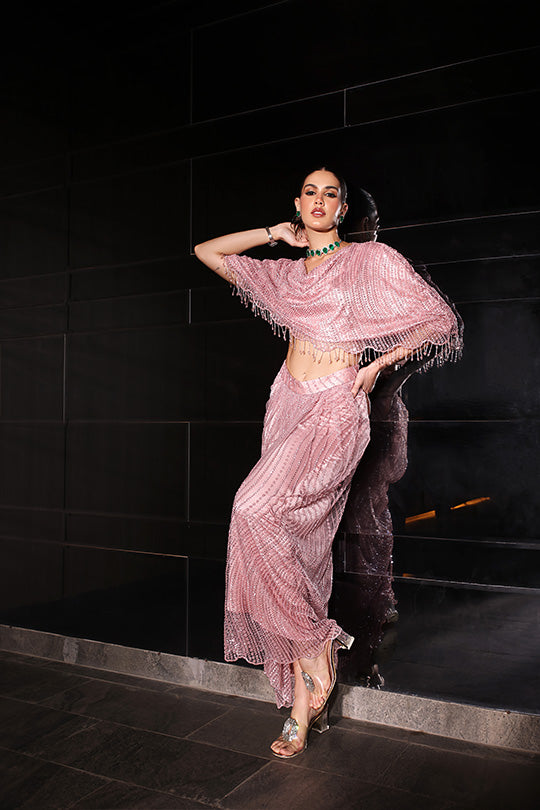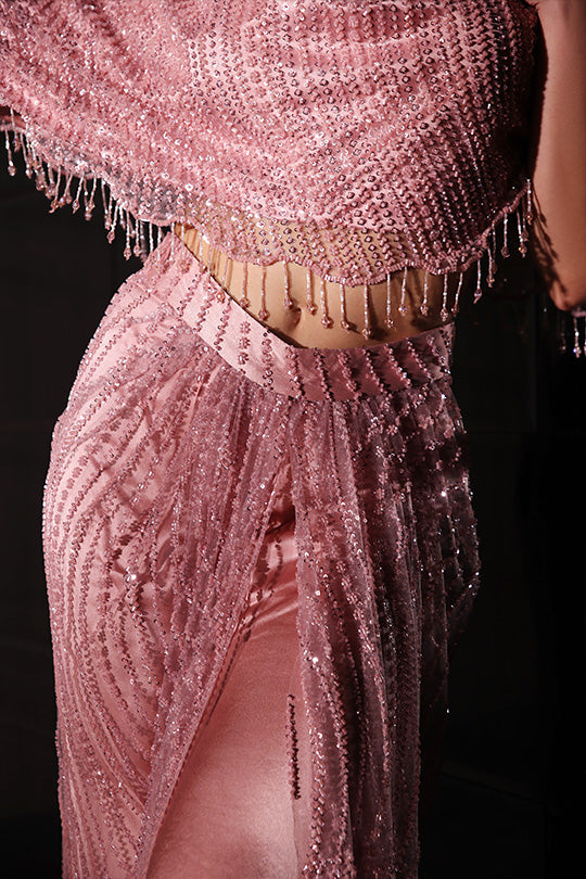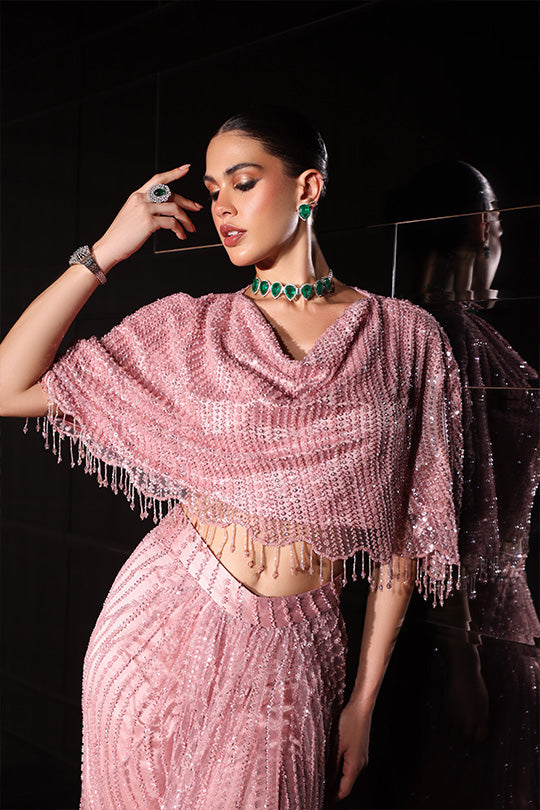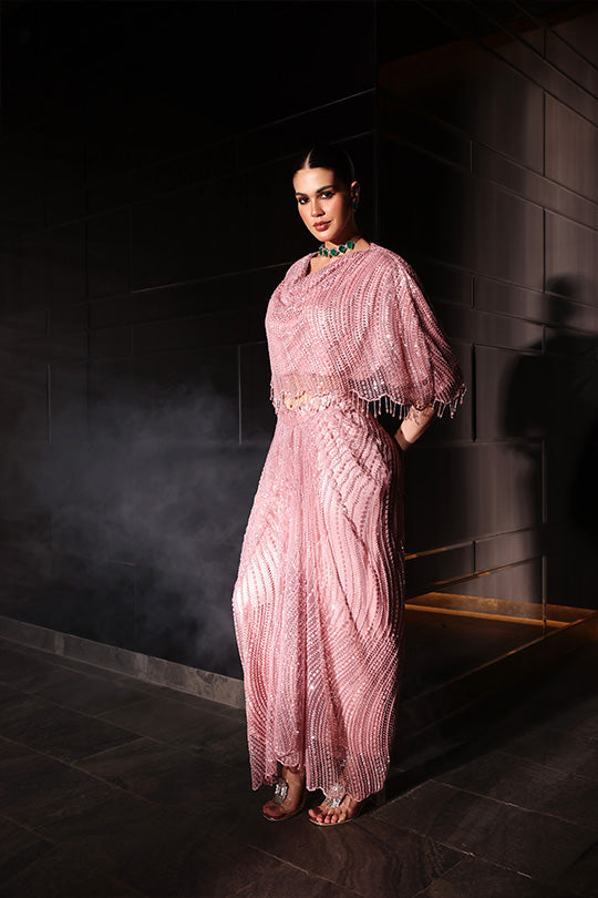 This stunning pink set features a net-based design with a flowing skirt and crop top, adorned with intricate cutdana work, sequins, and thread embroidery in a shimmering floral pattern. The highlight is a attached crop cape top, embellished with matching embroidery, adding drama and elegance. Perfect for festive occasions or evening events.