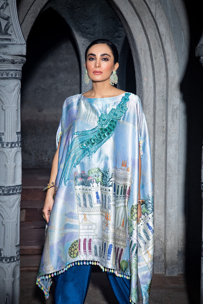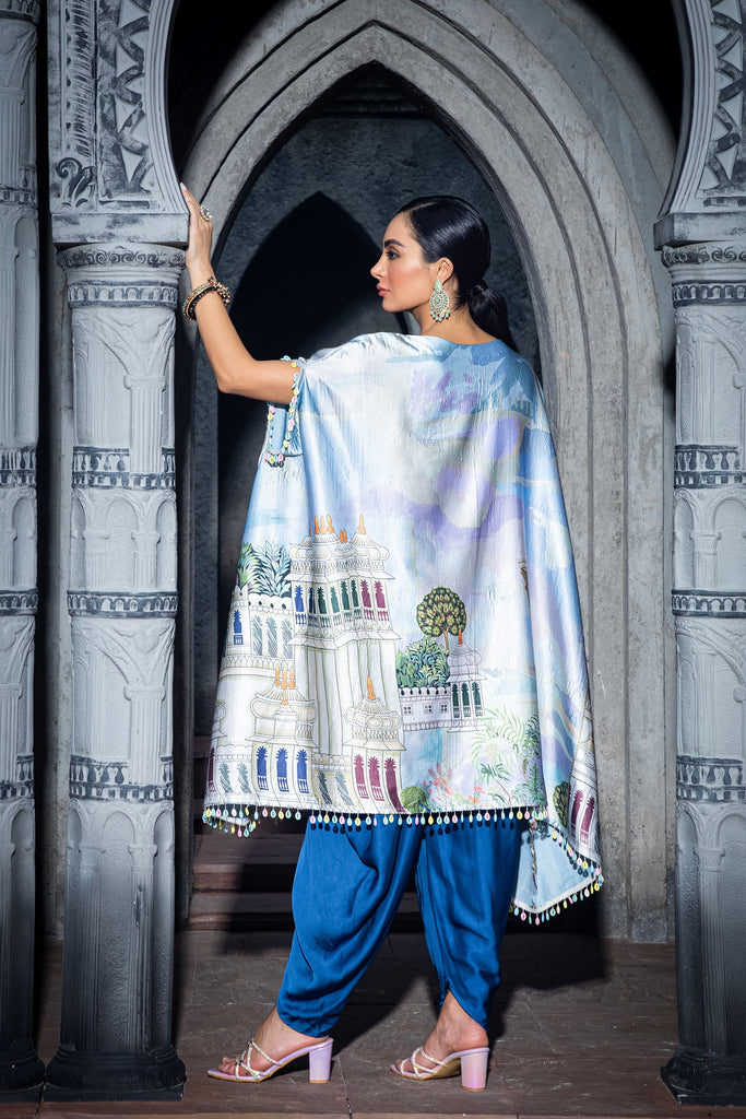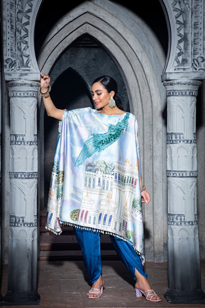 An all-over printed kaftan with intricate 3D work on the neckline and colorful tassels perfectly complements a brightly colored dhoti. It's both comfortable and classy.