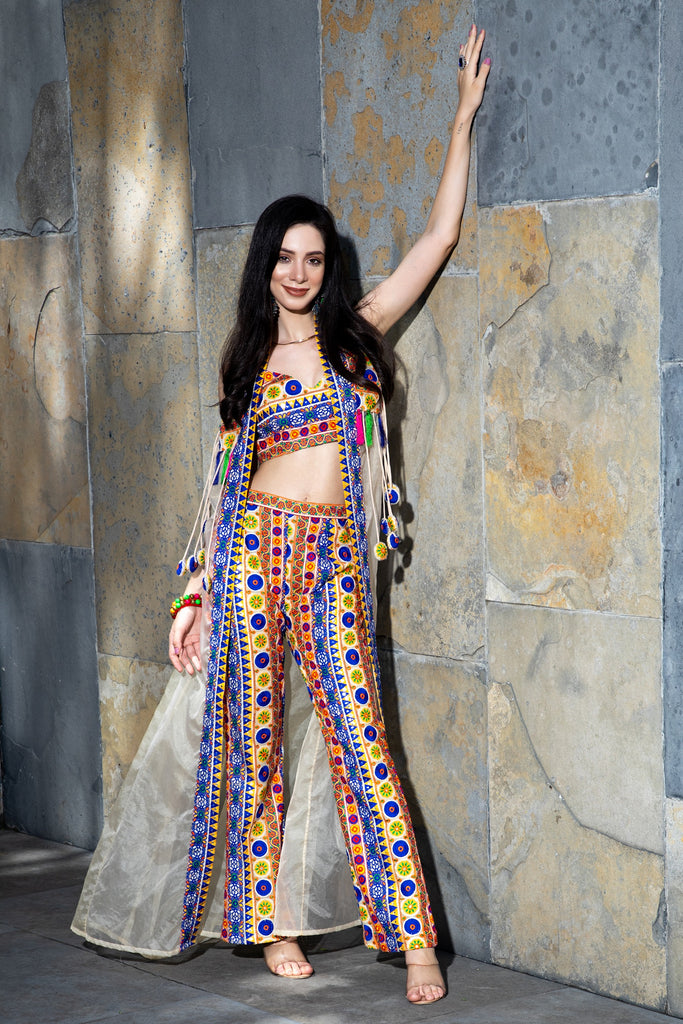 Multicolored three-piece cape set includes a blouse with all-over thread embroidery, high-waisted straight flared pants with multi-threaded detailing, and an organza cape with tassels and pom-pom hangings.