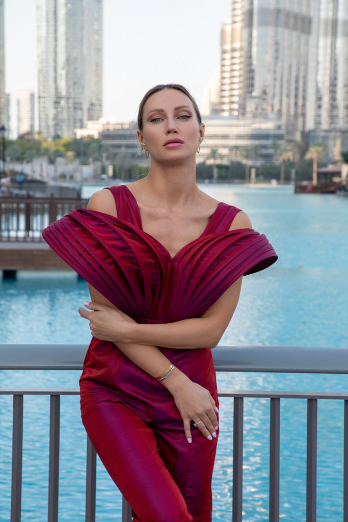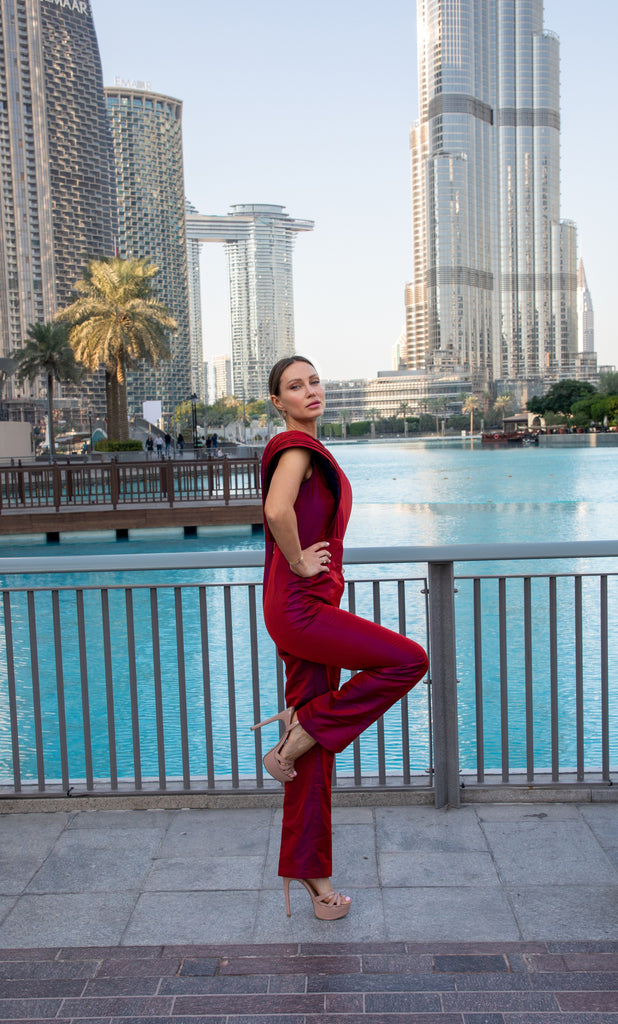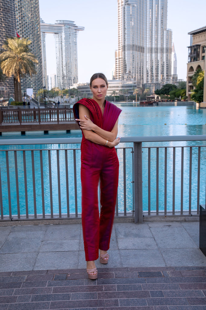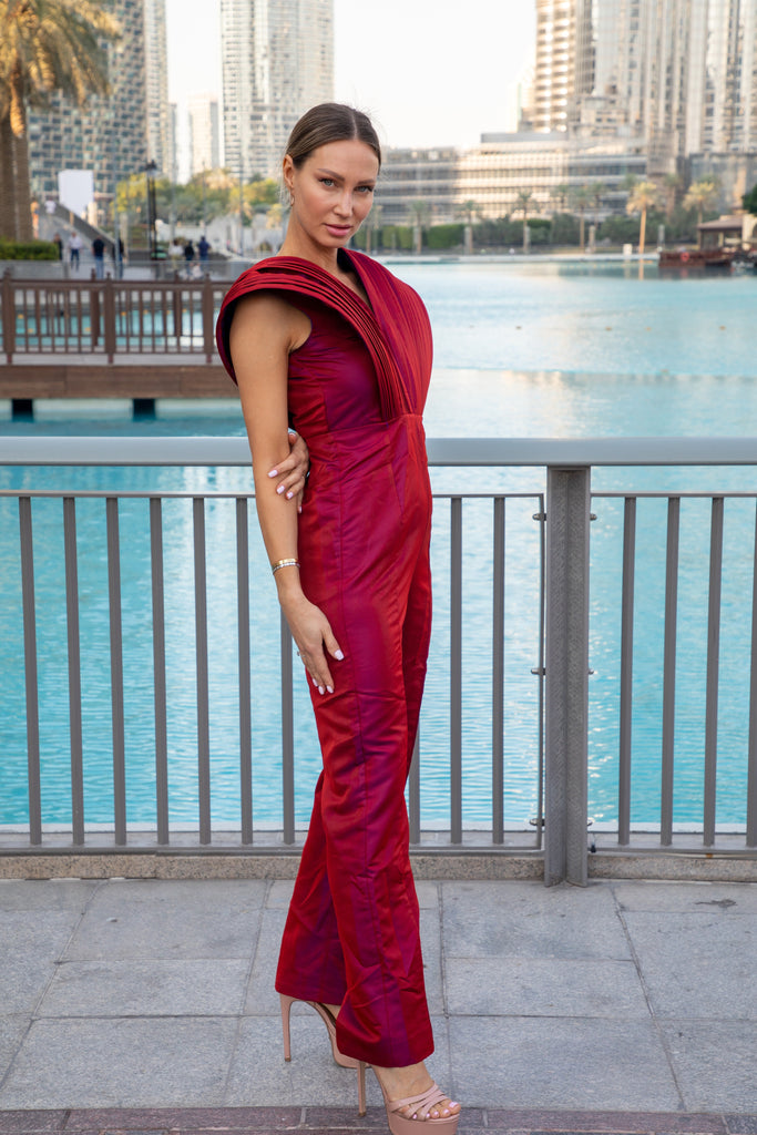 Behold, the majestic jumpsuit of the ages! This bad boy is made of dual color satin tafta, so you'll be looking twice as fly. And check out those flouncy hard bone stylish sleeves - they're like a party for your arms! It's like wearing a work of art, except you can also wear it to the club. So go ahead, slip into this jumpsuit and let the world know that you're not afraid to take fashion risks.