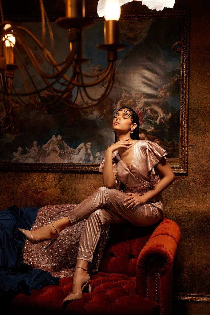 This outfit is a jumpsuit with shimmery V-neck and ruffled elbow-length sleeves. It has sequins draped from the waist, with one side reaching the floor.