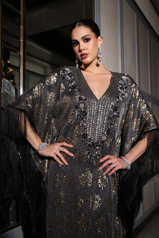 This stunning black kaftan features a rich blend of sequins, showcasing intricate silver sequin embroidery in a paisley pattern across the neckline, sleeves, and hem. The flowing silhouette is accented with black fringe detailing along the edges, adding a touch of drama. Perfect for evening events or festive occasions, offering a luxurious and elegant look.
