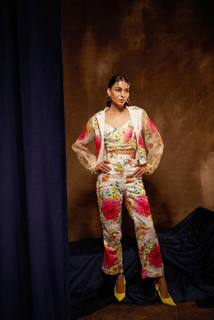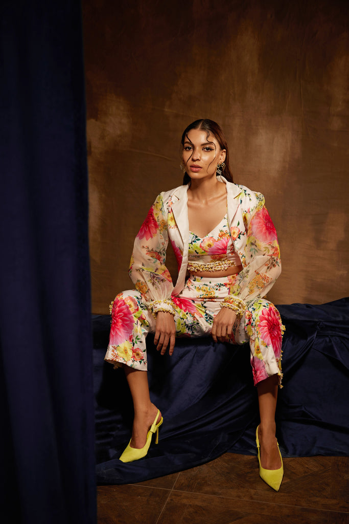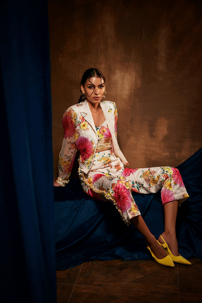 This is a floral three-piece matching outfit that includes a short blazer, a bustier, and pants. The blazer, bustier, and pants have pearl lace accents on the sleeves, ends, and sides, respectively.