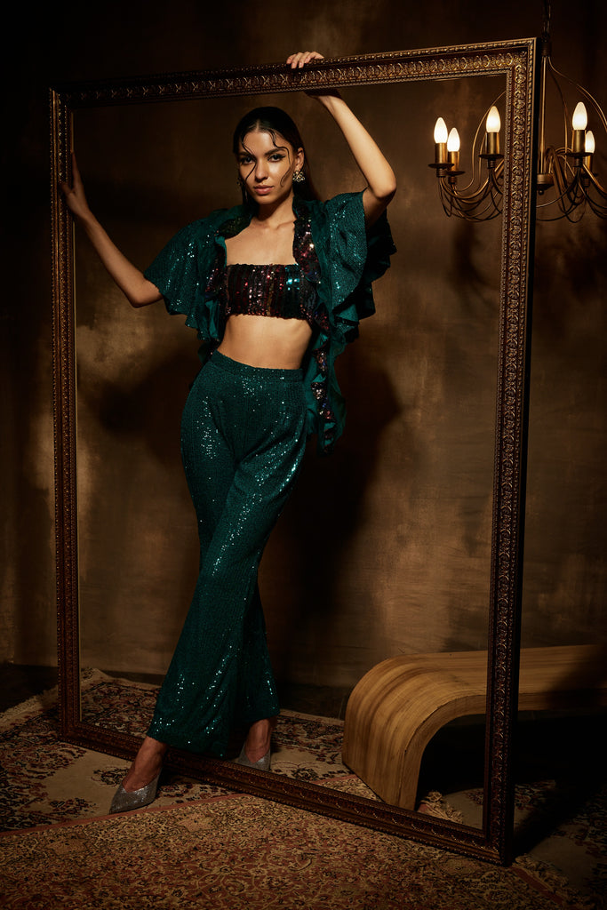 This outfit comprises a three-piece set featuring a sequence blazer, bustier, and pants. The blazer is ruffled and open, while the pants have a straight fit. The outfit is colored emerald green.
