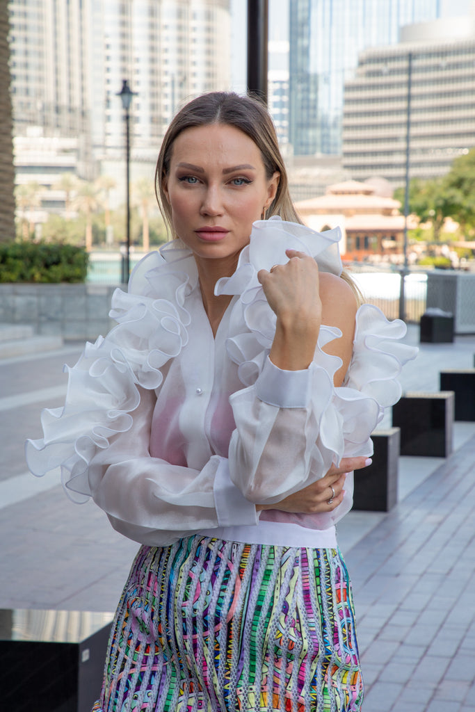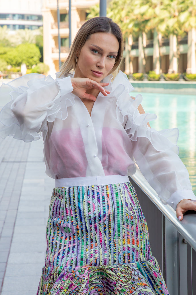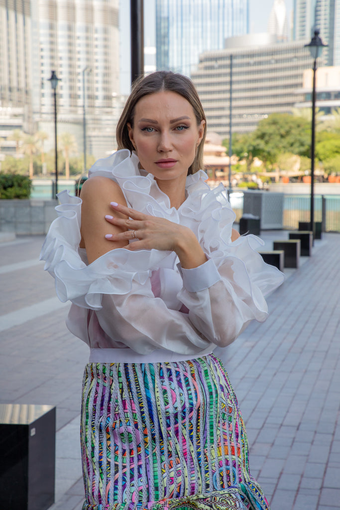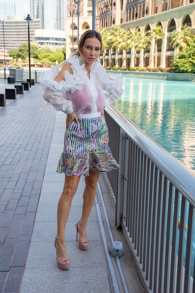 Behold! Feast your eyes upon the magnificent, pearl white ruffle cutout sleeved top, paired perfectly with a high tiered, short, multicolored striped zig zag flared skirt at the bottom! It's like a fashion explosion in your closet!
