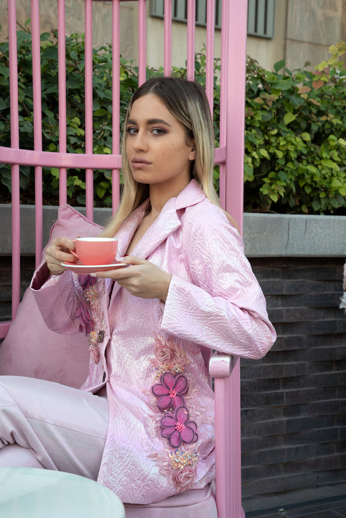 Fancy schmancy sailor jacket with flowery bling and snazzy pants.
