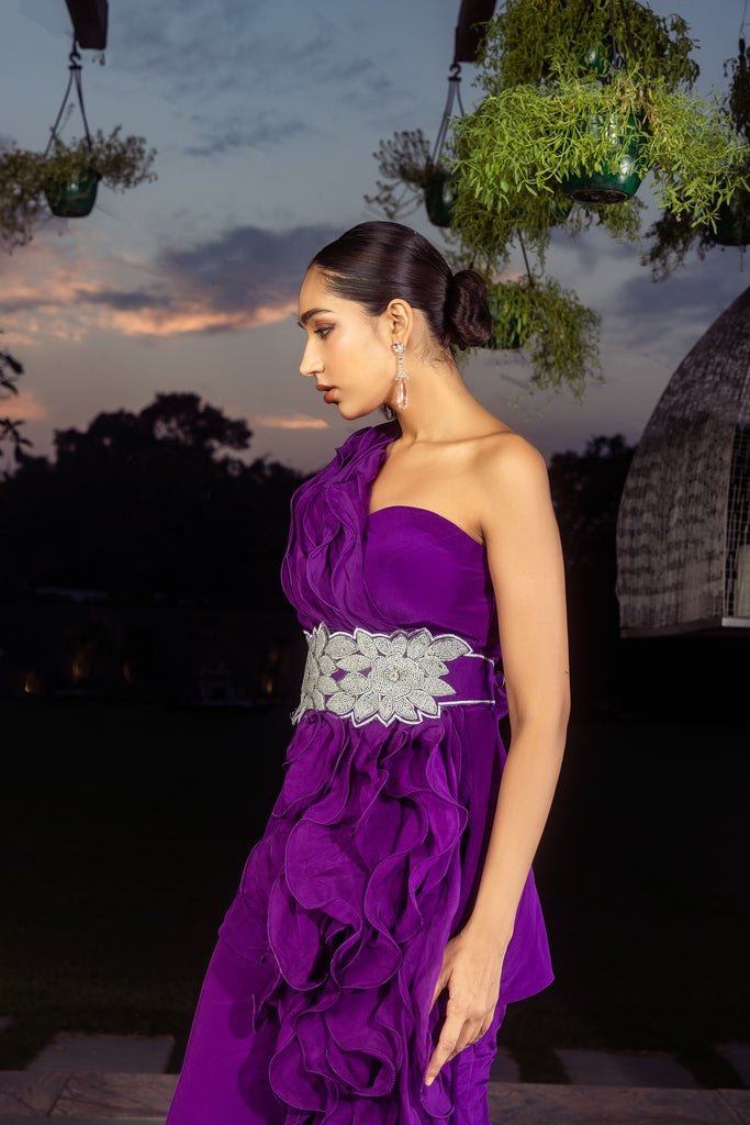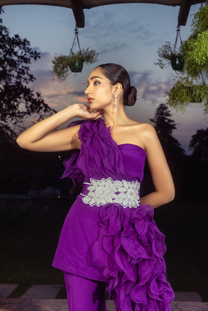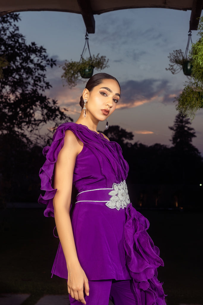 Check out this amazing co-ord set! It features a ruffled one-sided top and pants, complete with a stunning heavy stone and cutdaana belt. The diagonal ruffles from top to floor give it a formal look that's perfect for any party.