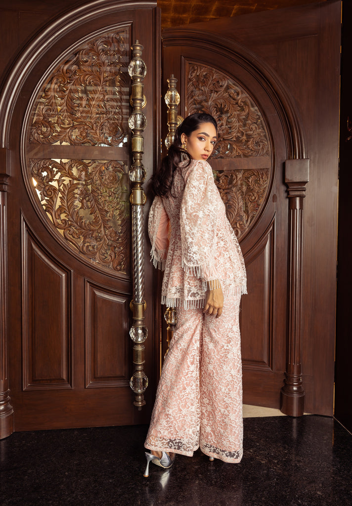 Wow, get ready to turn heads in this stunning ensemble! These beautiful blush pink sharara pants are detailed with a gorgeous all-over floral pattern that is sure to make you feel like a true fashionista. The pants are perfectly coordinated with a short, stylish A-line top that complements the sharara bottoms perfectly. The top is embellished with transparent lace on the sleeves and bottom, adding an extra touch of elegance and sophistication. You'll feel confident, stylish, and absolutely gorgeous in this amazing outfit!