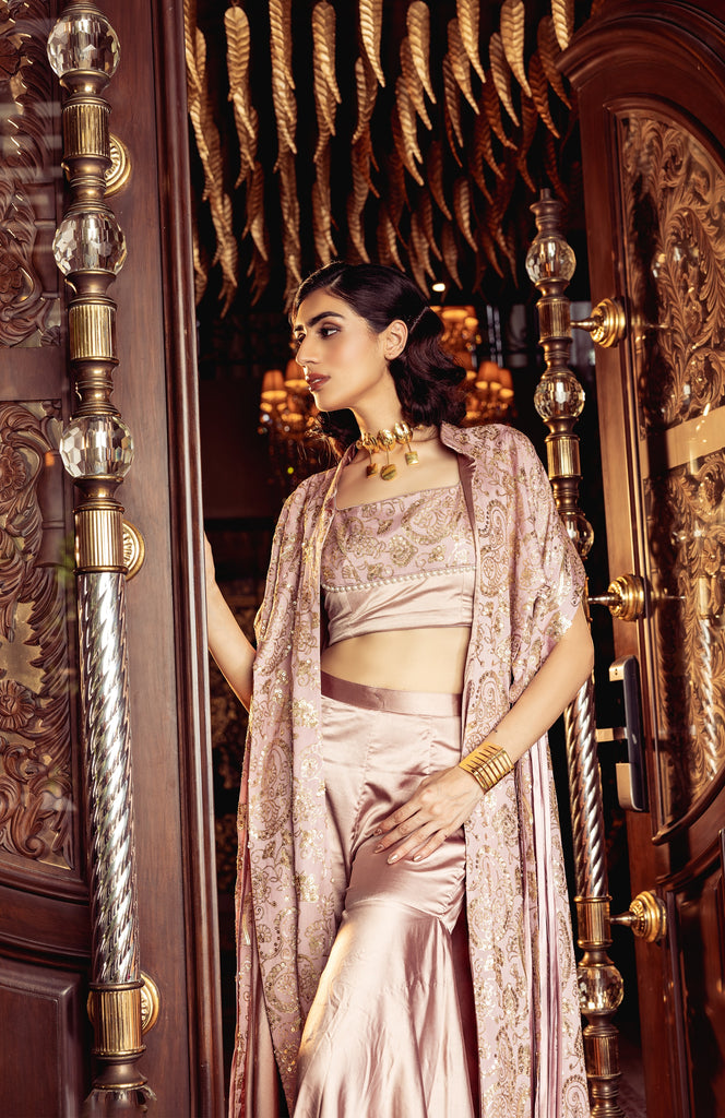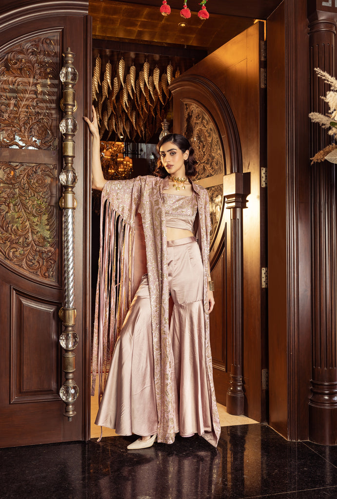 Get ready to turn heads with this stunning three piece cape sharara set! With a heavy sequence cape and blouse paired with a sleek satin sharara set, you'll be the talk of the town. The fringe tassled floor length detailing on the sleeves adds a touch of glamor and drama to this already show-stopping ensemble. Don't settle for ordinary, elevate your wardrobe with this gorgeous cape sharara set today!