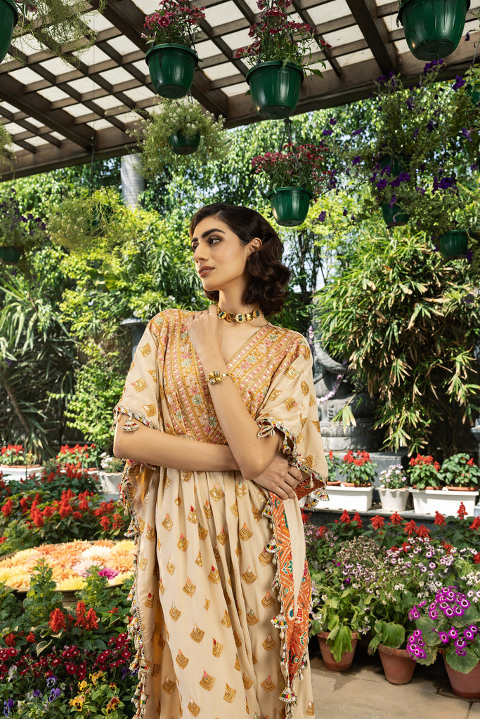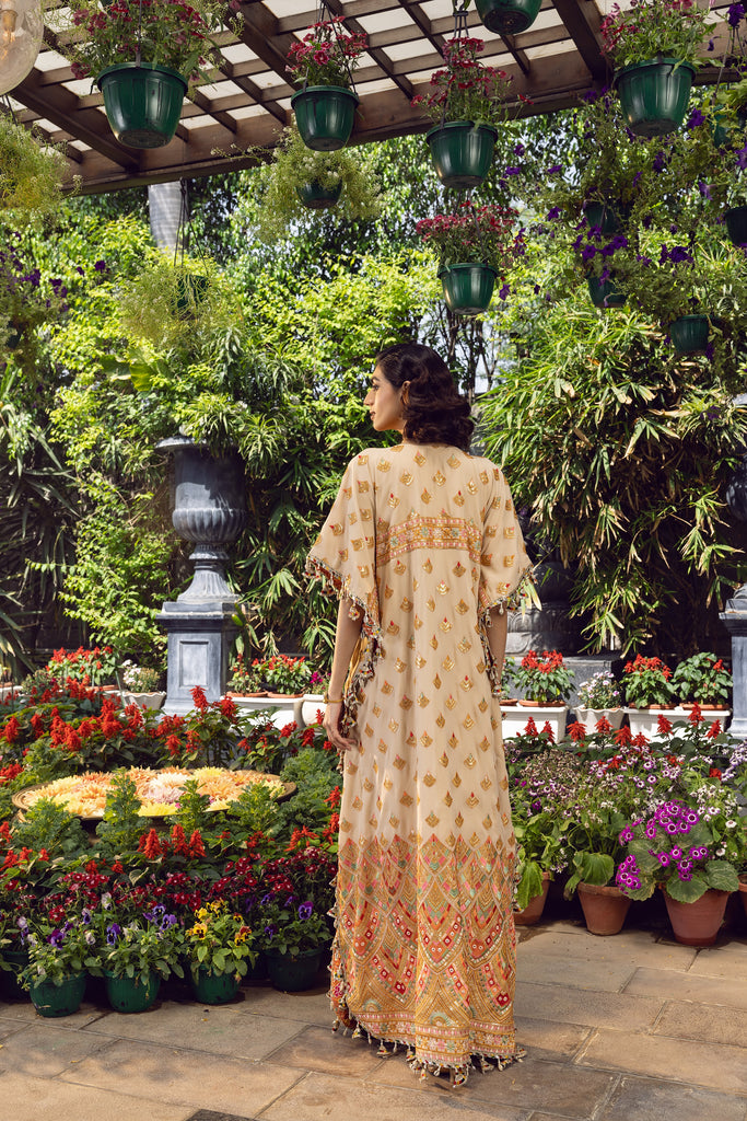 This kaftan is a beauty! It's beige with multicolored thread detailing all over the neck and gold sequence kite-shaped embroidery all over. It also has tassels on the sleeves that add a fun touch to the overall design.
