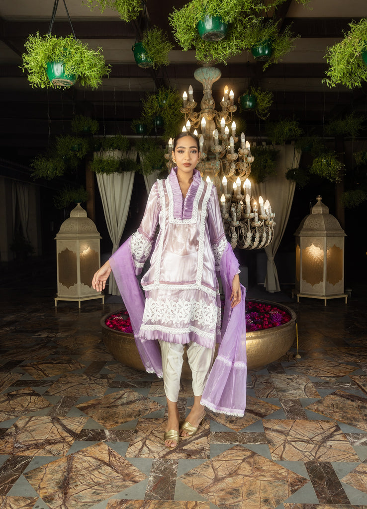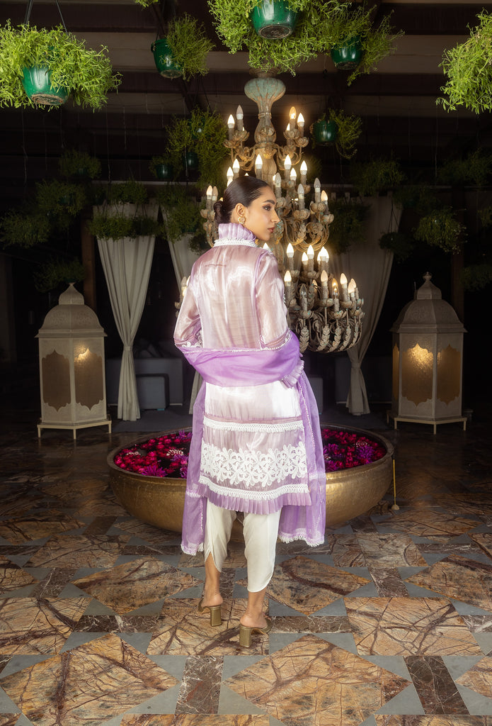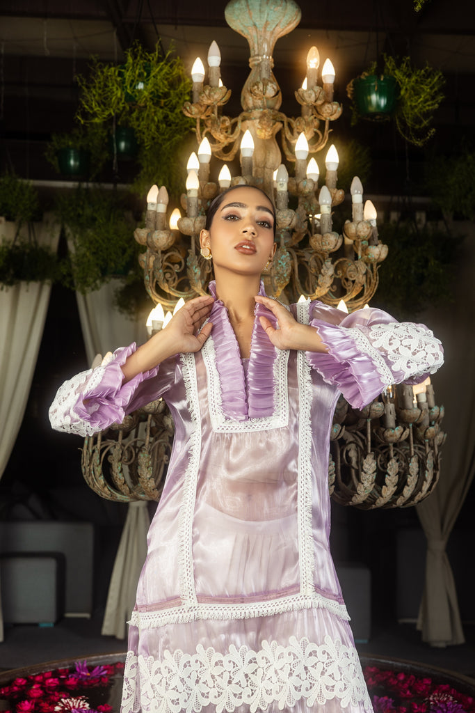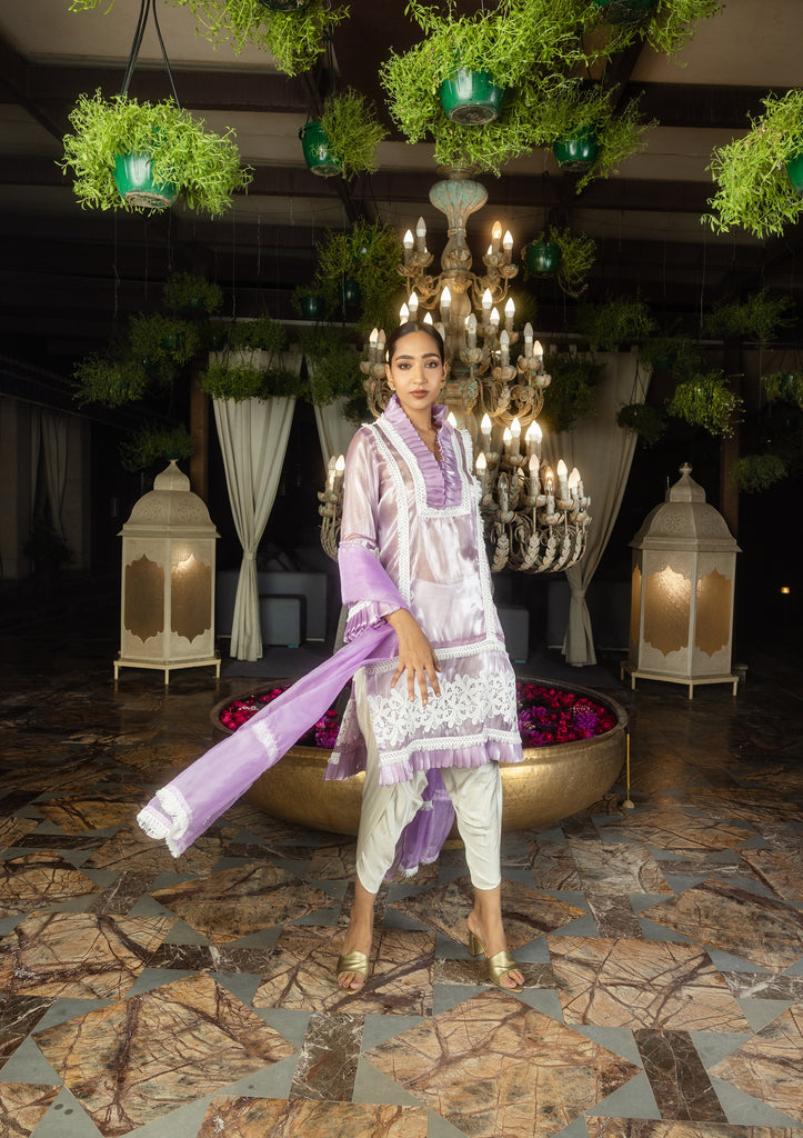 Get ready to look stunning in this amazing lilac suit! It's made of soft organza and comes in 4 pieces, including a separate cami, looser fit shirt, pakistani dhoti, and dupatta. You'll love the white cutwork laces all over the top and the ruffle detailing on the neck. Don't miss out on this gorgeous outfit!