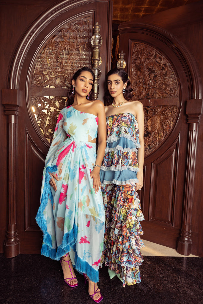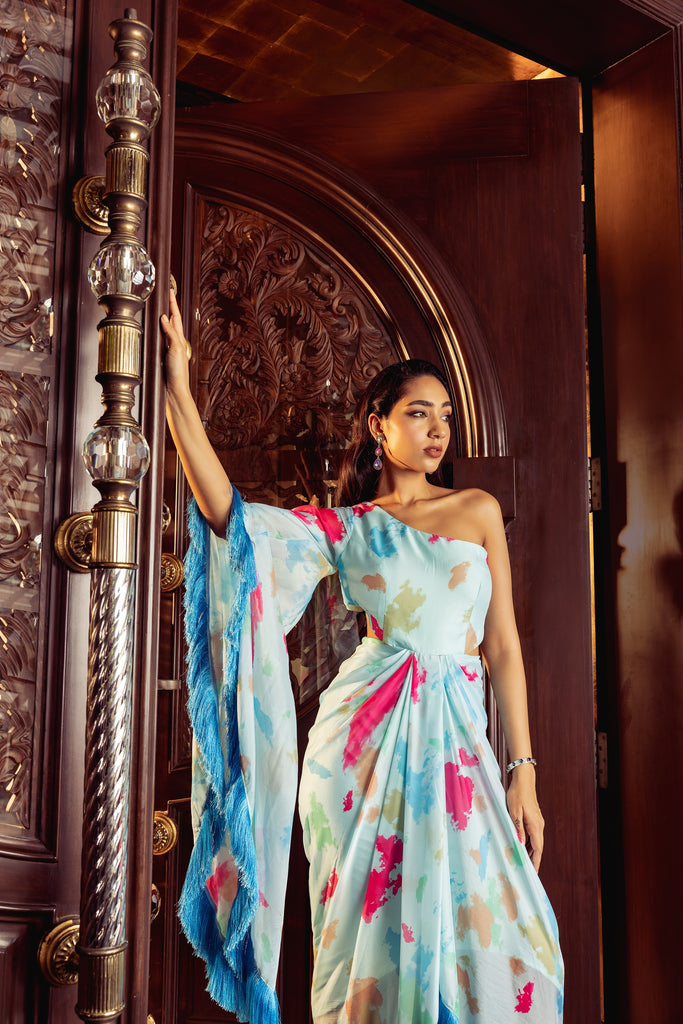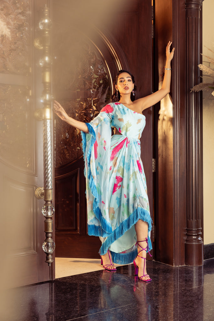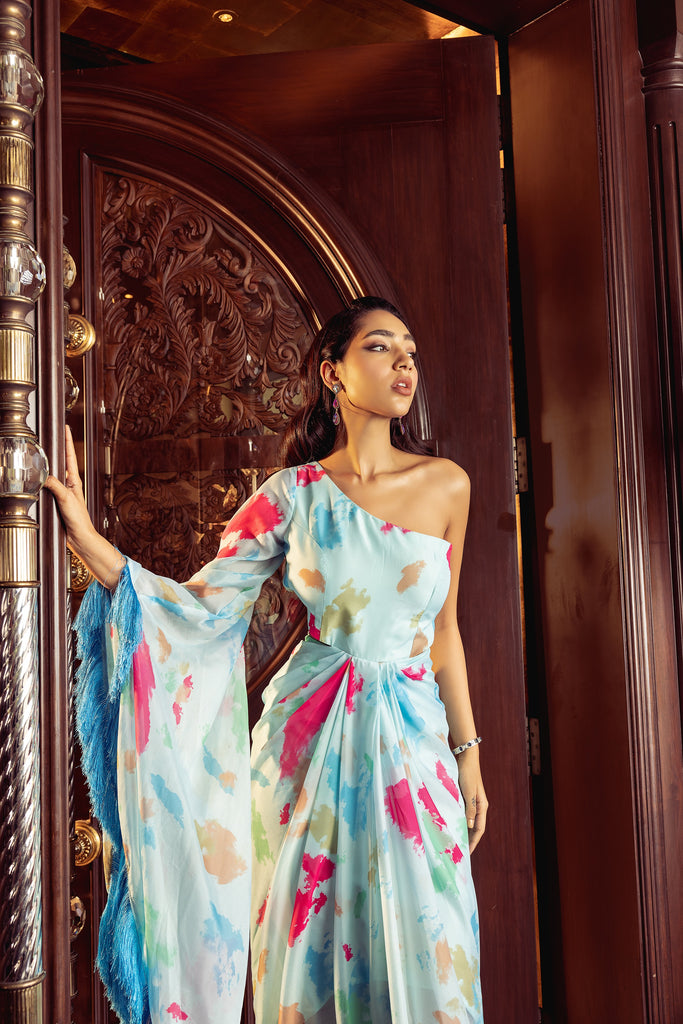 Get ready to turn heads with this stunning one-sided sleeved maxi dress! Featuring a gorgeous pastel color palette and multi-stroke design, this dress is the perfect choice for any fashion-forward individual looking to make a statement. The tassel fringe detailing on the sleeves adds a touch of bohemian flair, while the easy-to-wear design makes it a breeze to slip on and go. What's more, this dress is a modern take on the traditional drape saree, seamlessly converted into a chic and stylish gown. Don't miss out on this must-have addition to your wardrobe!