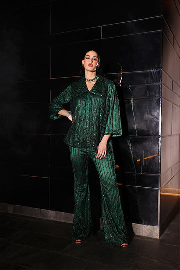Turn heads in this emerald green cutdana co-ord set, crafted with shimmering hand-embellished detailing. Featuring a relaxed fit shirt with a deep neckline and flared trousers, this statement ensemble blends modern glamour with timeless elegance—perfect for festive celebrations, cocktail nights, and evening soirées.