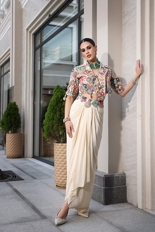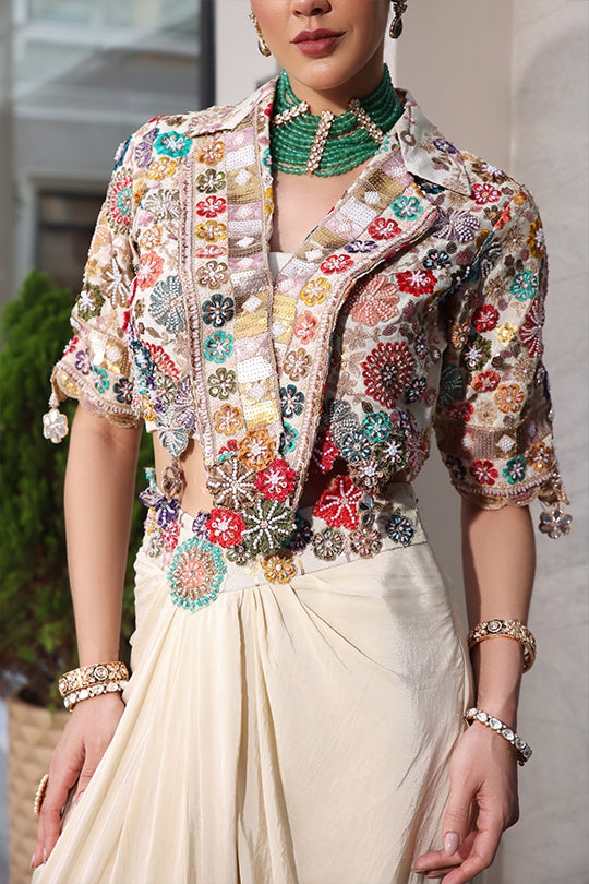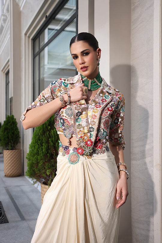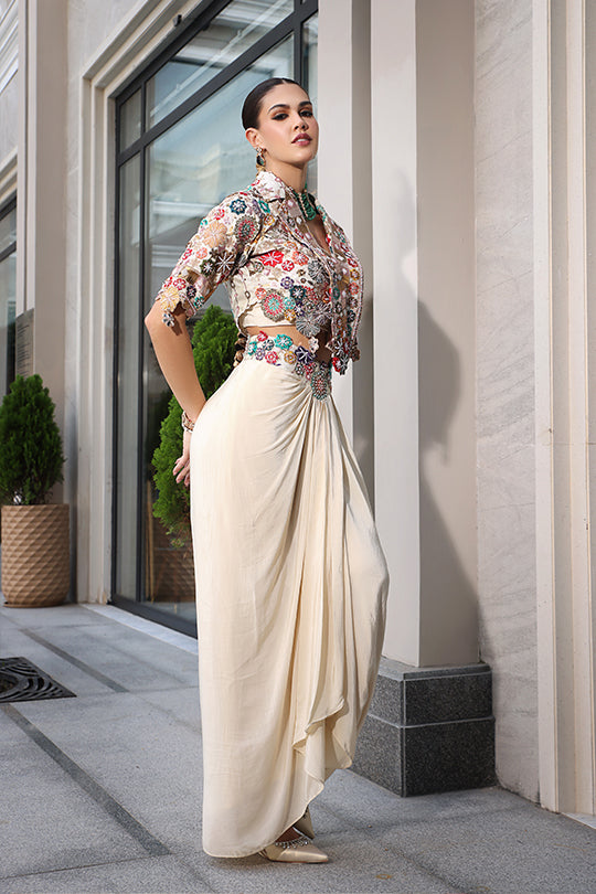 This sophisticated set features a vibrant floral embroidered cape in multi-colored threads and sequins, draped over a sleeveless collared blouse for a bohemian flair. Paired with a flowing pure crepe skirt in soft ivory, it offers an asymmetric hem with subtle ruching for elegant movement. Perfect for evening events or cultural gatherings, blending artistic embroidery with effortless sophistication.
