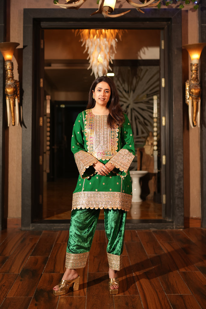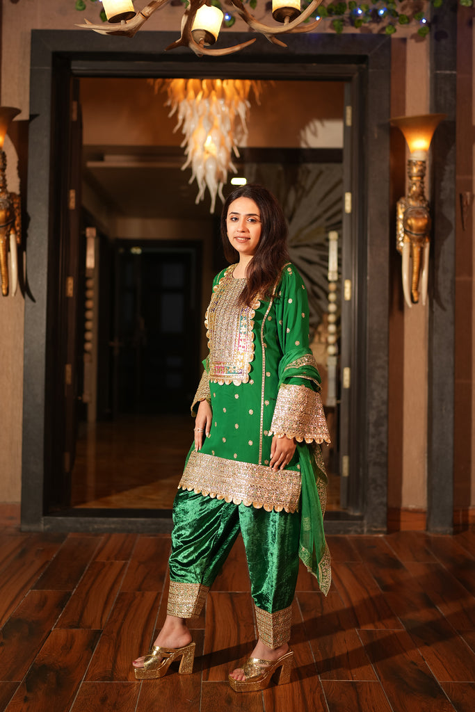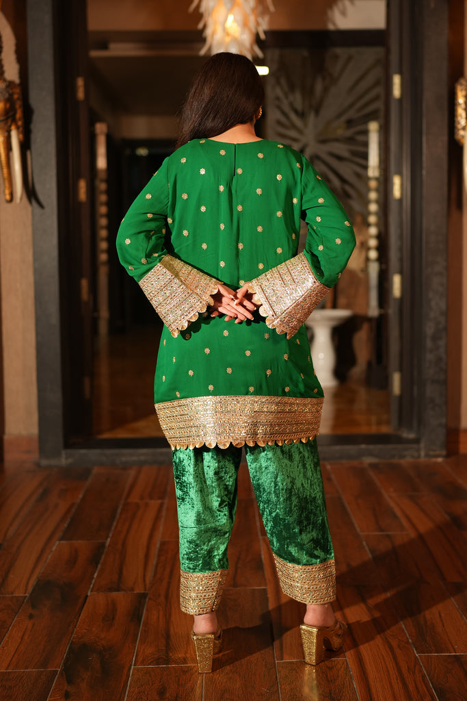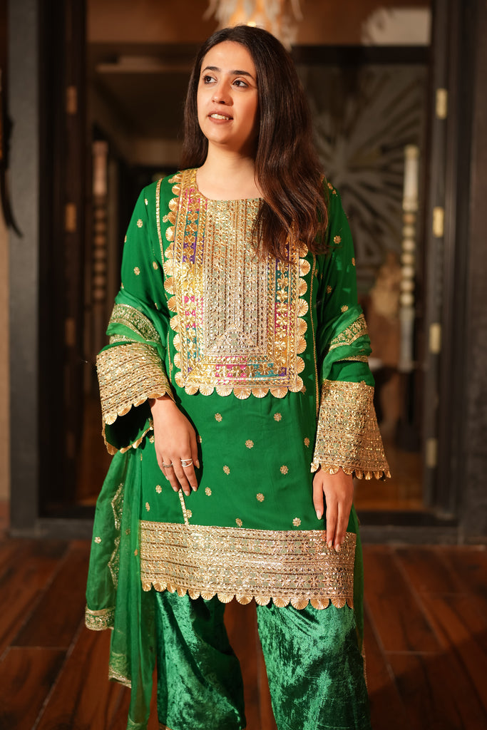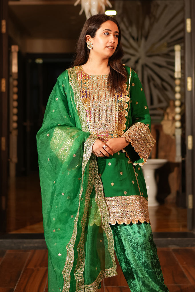 This emerald Green full suit set is a true showstopper! The kameez (top) features heavy embellishment on the front panel with intricate metallic gold and silver hand embroidery forming detailed patterns. Small gold motifs are scattered across the entire shirt enhancing the outfit. The Pakistani salwar is made from matching green velvet and the cuffs of the salwar are highlighted with embroidery that ties them seamlessly to the design of the upper. The organza dupatta with scattered gold motifs completes the look of the entire garment.