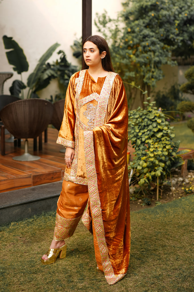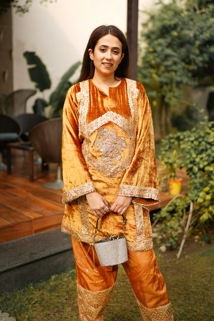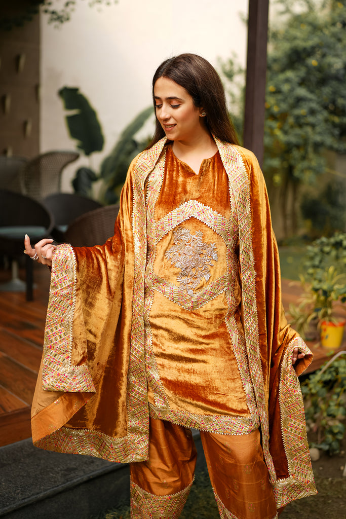 This beautiful Mustard velvet outfit exudes a sense of elegance and richness. the kameez (tunic) is adorned with intricate embroidery, feathering goat and foil work that contrasts beautifully with the deep base colour. The central embroidery framed bt a diamond shaped design outlining adds symmetry and draws attention to the inte=ricate detailing. The salwar are tailored with embroidered accents at the hem, complementing the shirt and the dupatta.