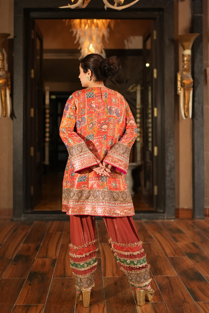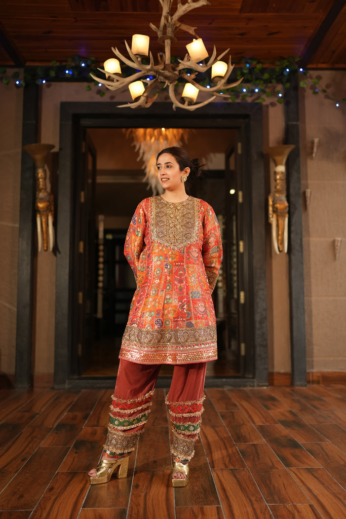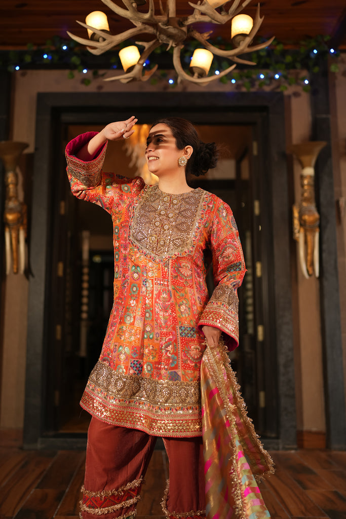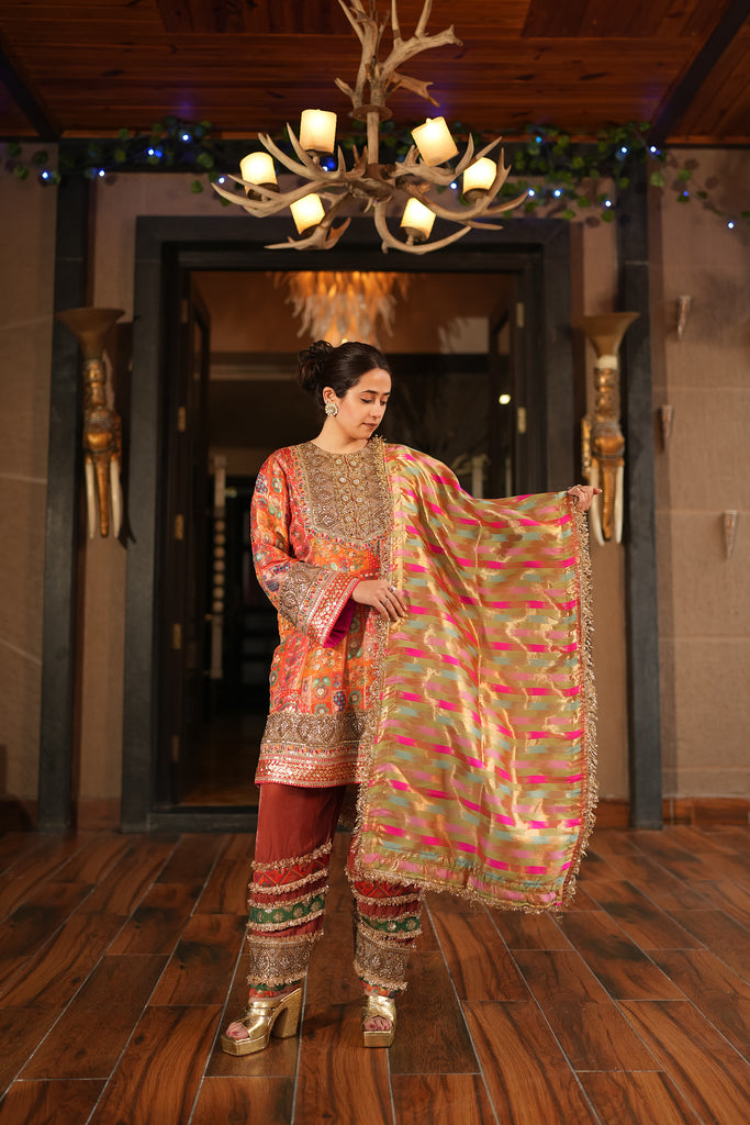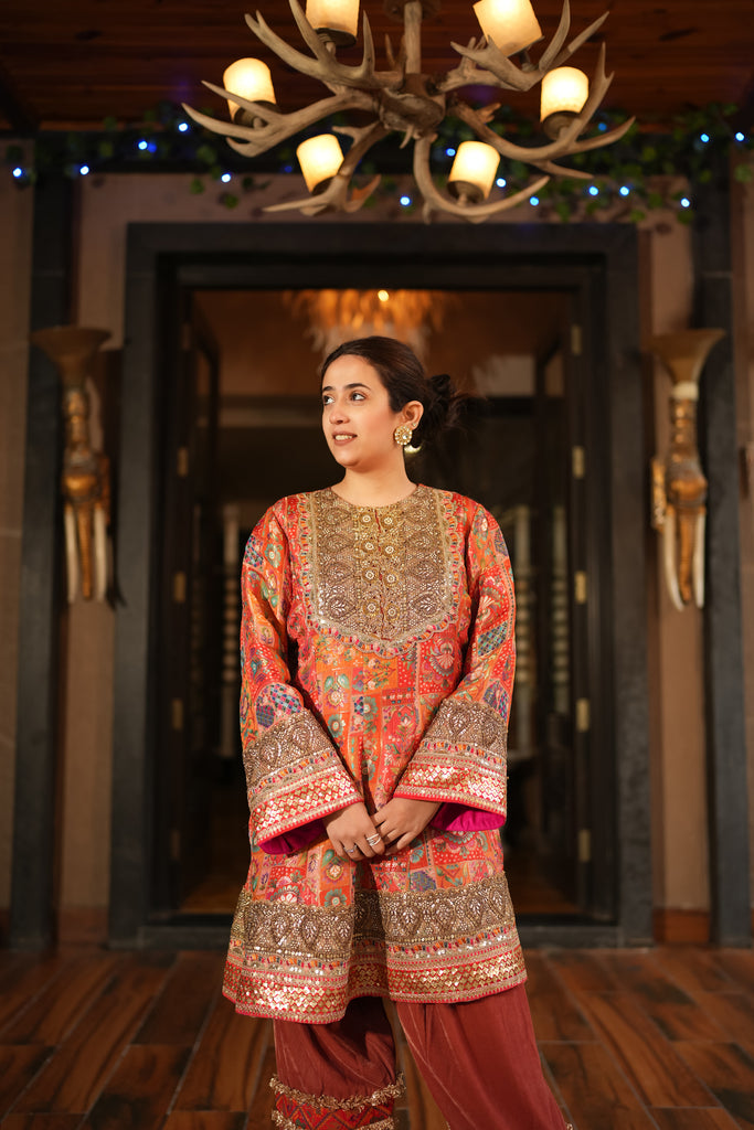 The lush texture of Banarasi silk combined with the delicate bronze handwork detailing on the neck, arms, and the bottom of the A-line shirt is a perfect blend of tradition and elegance. The floral patterns on Banarasi fabric add such a regal touch, and the bronze handwork will create a beautiful contrast, elevating the whole look. The outfit is paired with the same colour velvet afghani salwar with detailed embroidery at the hem and with a contrast multicolour dupatta.