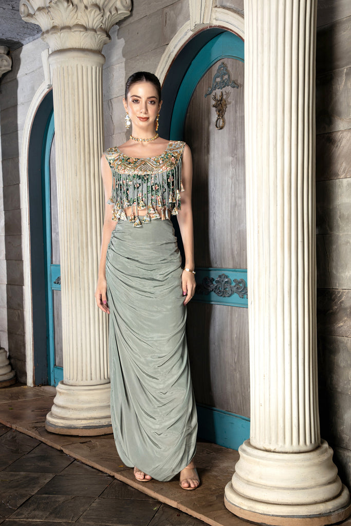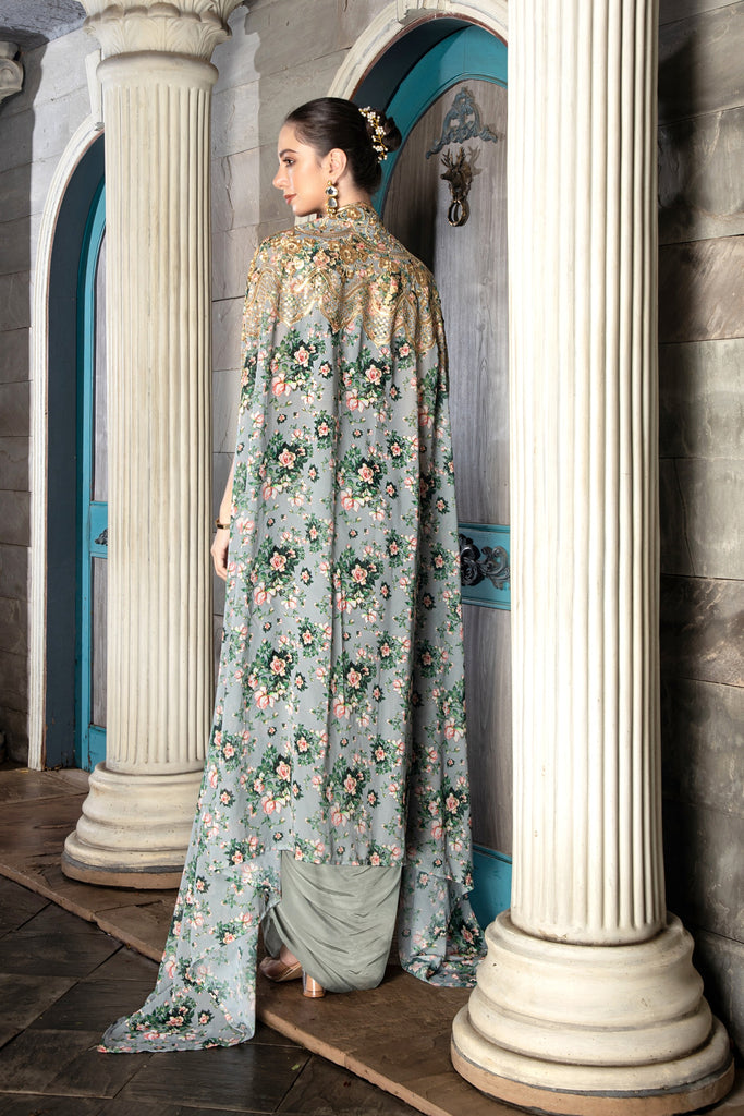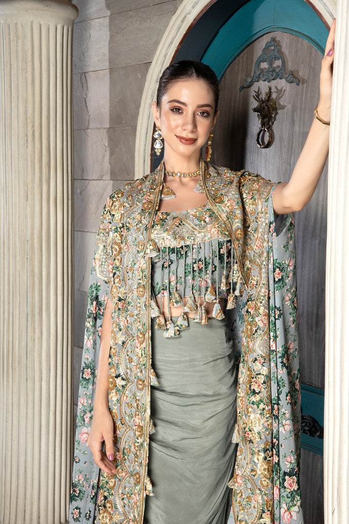 All-over printed and embroidered georgette three-piece cape set. Heavy work on blouse neckline with hangings for enhancement. Includes full-length, all-over printed, embroidered asymmetrical cape and plain crepe dhoti skirt.