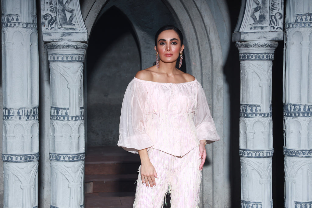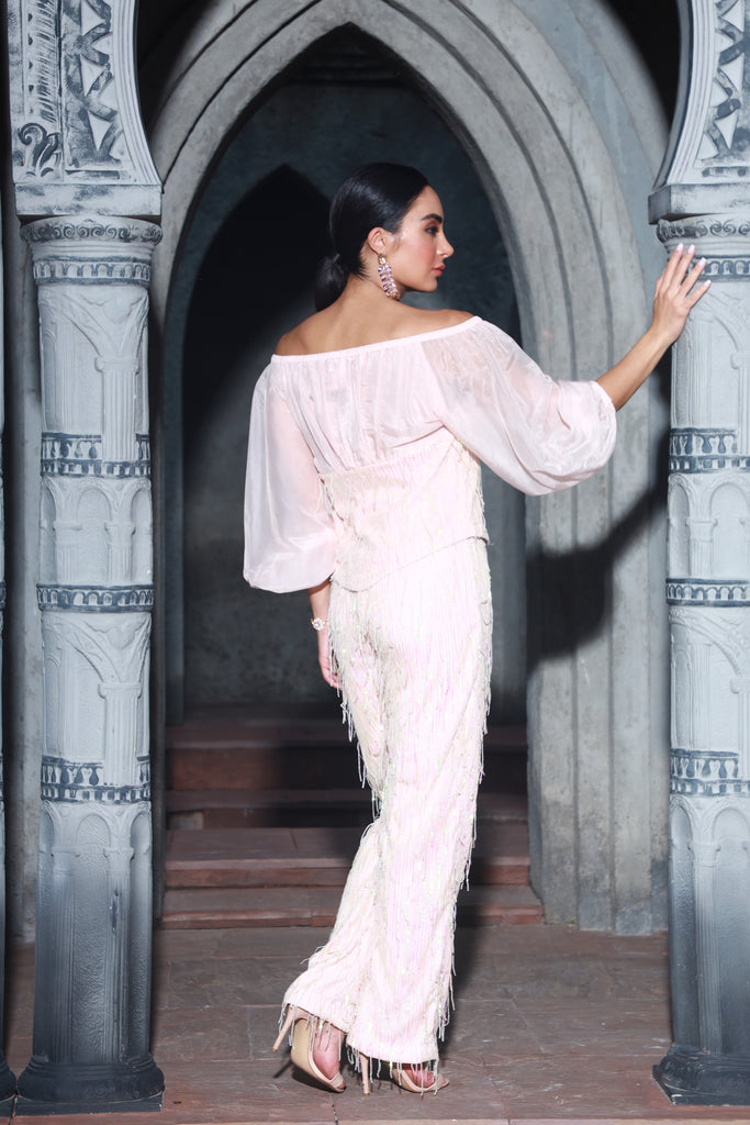 This co-ord set includes a baby pink sequined tube top and fringe pants. The color is inspired by Barbie.