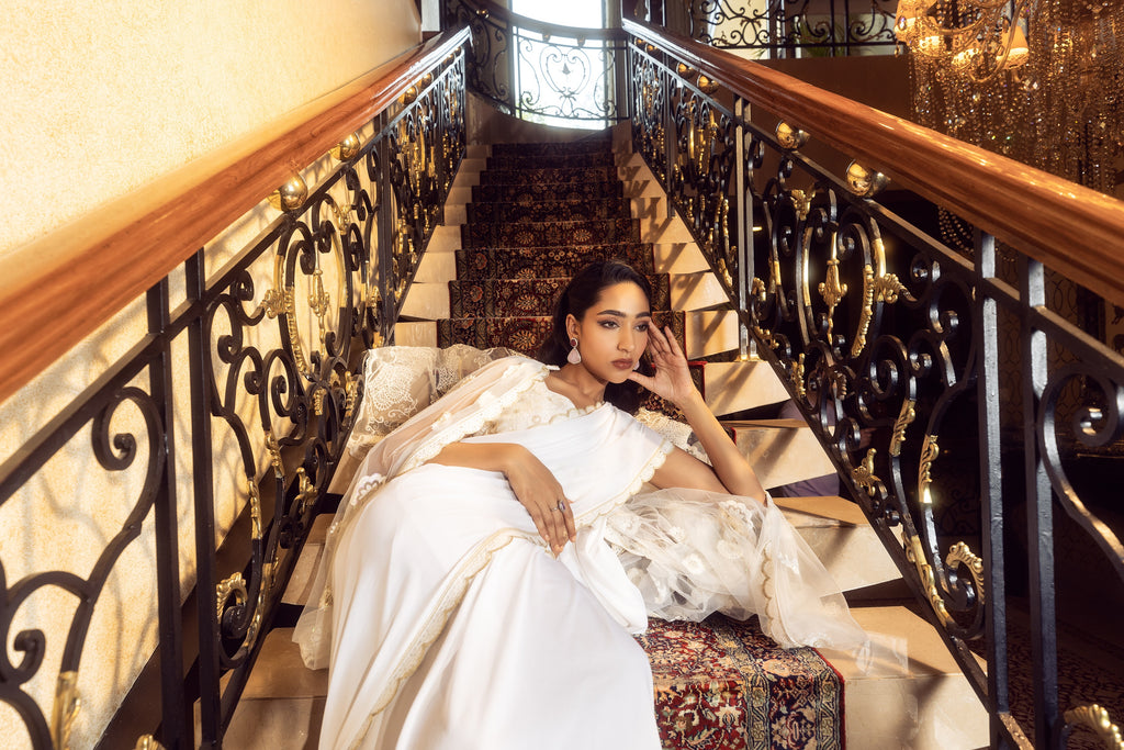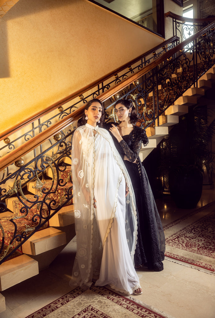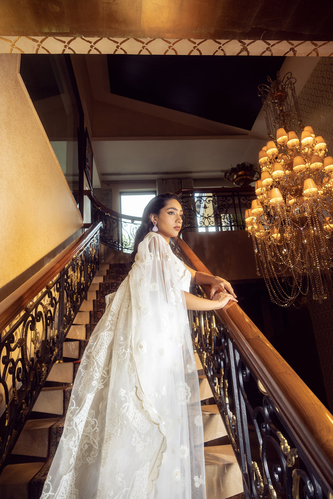 Get ready to turn heads with this stunning ensemble! The beautiful hues of white in this cape statement outfit will make you look like a dream come true at any event. Complete with a work blouse, separate cape, and unstitched saree, this outfit is perfect for any occasion. Don't miss out on the chance to feel confident and look absolutely gorgeous in this must-have outfit!