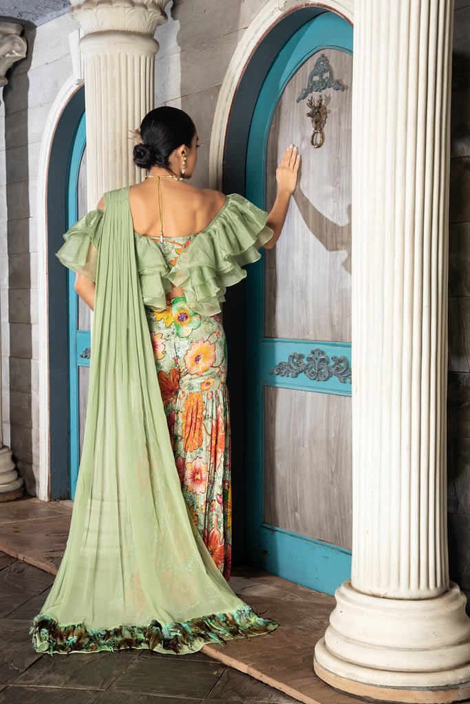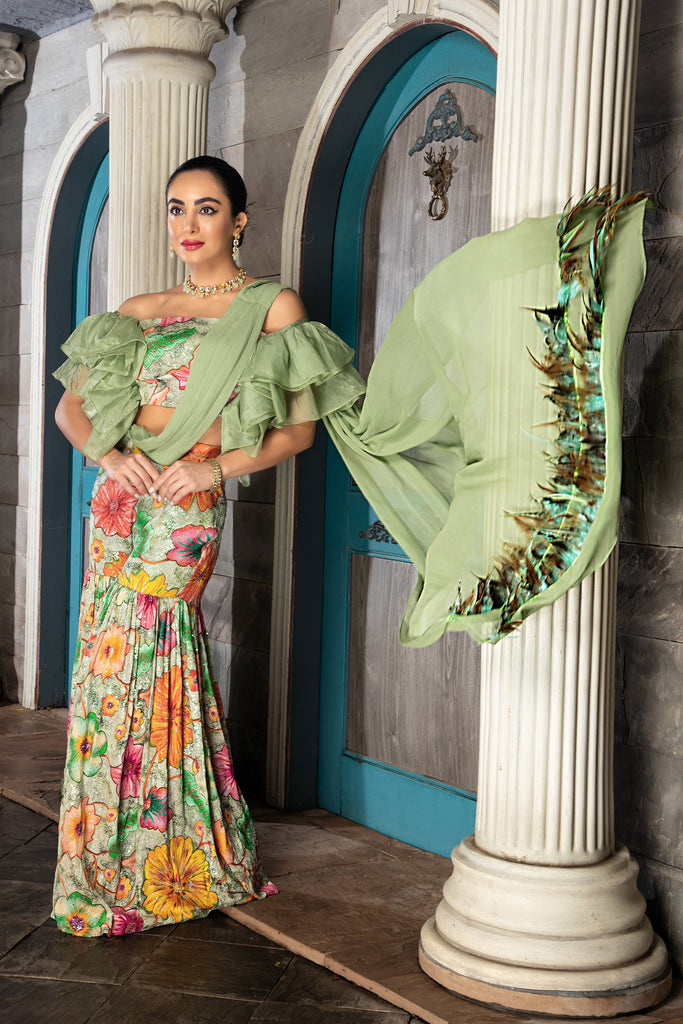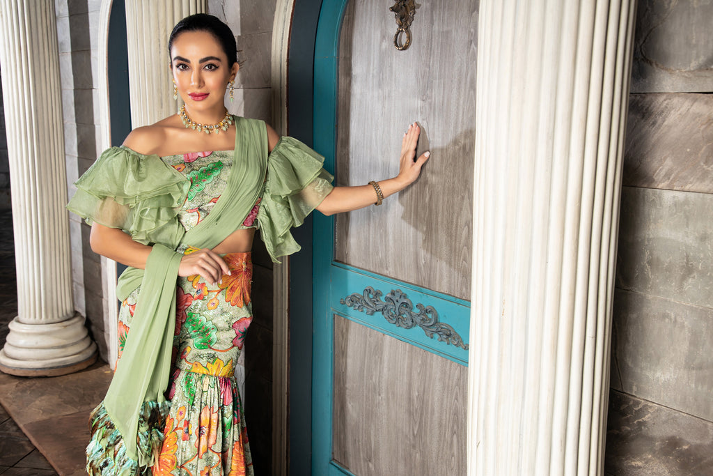 The floral tiered bodice with organza pleated three-layer sleeves as well as the high-waist flared fur sharara saree is an eye-catcher.