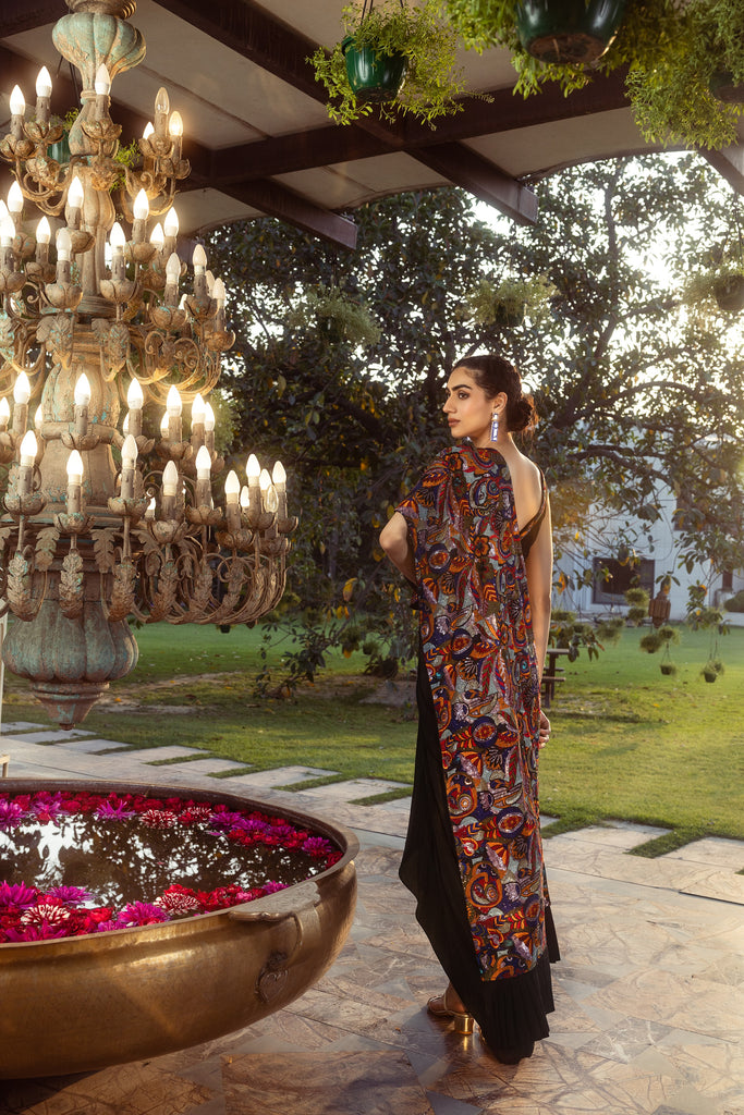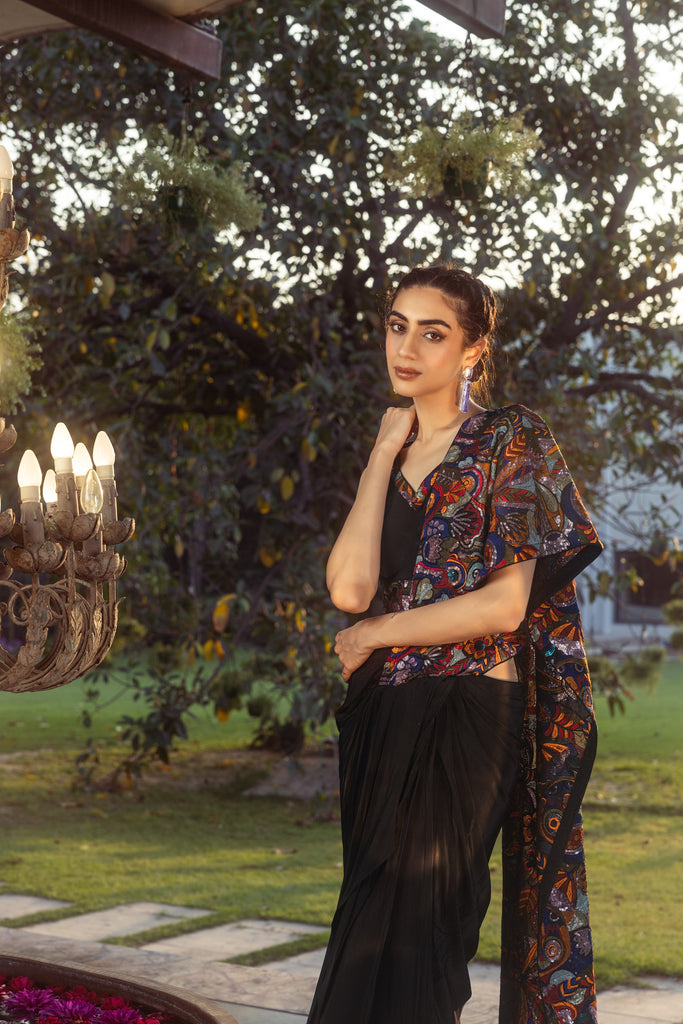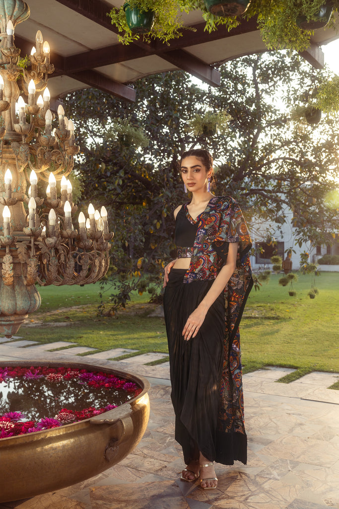 Check out our stunning two-piece drape saree! The blouse features intricate detailing on the neck and end, while the heavy drape boasts stylish sequins and thread work. This saree is sure to make a statement!