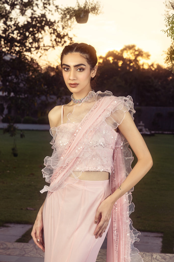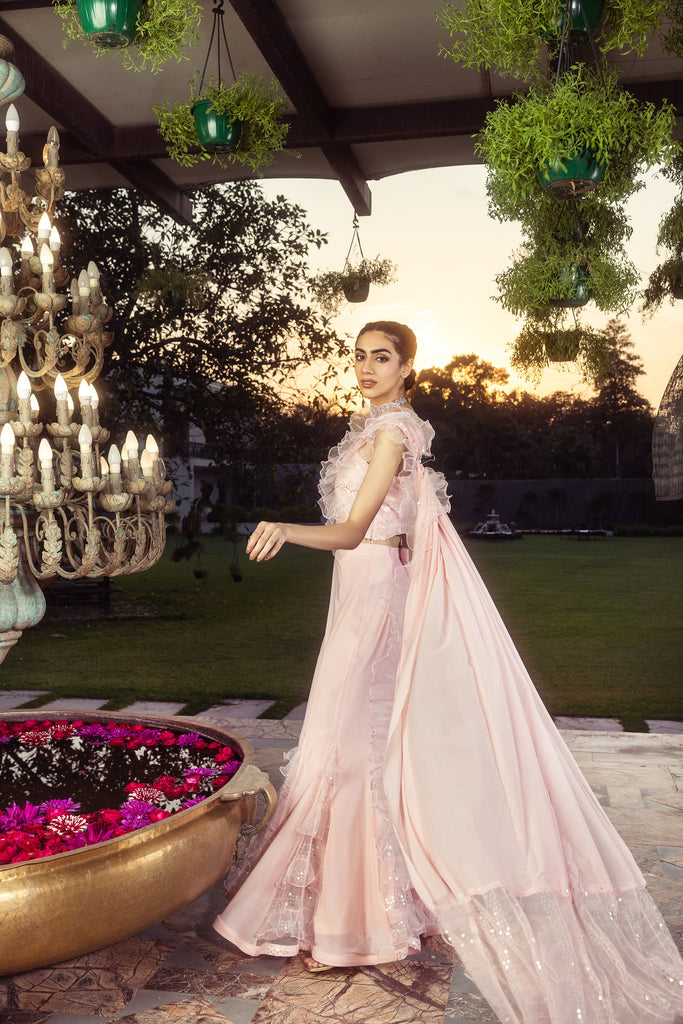 Get ready to steal the show with this stunning baby-pink saree! Featuring ruffles and layers at the bottom, this unstitched saree comes with a full work blouse and a trendy noodle strap design. Perfect for any occasion!