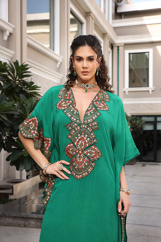 This vibrant green set features a short kaftan with intricate hand-embroidered floral motifs in zari, sequins, beads, and detailed thread work on the neckline, sleeves, and hem. Paired with a flowing skirt in matching silk, it offers a lightweight, comfortable fit with elegant embroidered borders. Perfect for casual outings or festive occasions.
