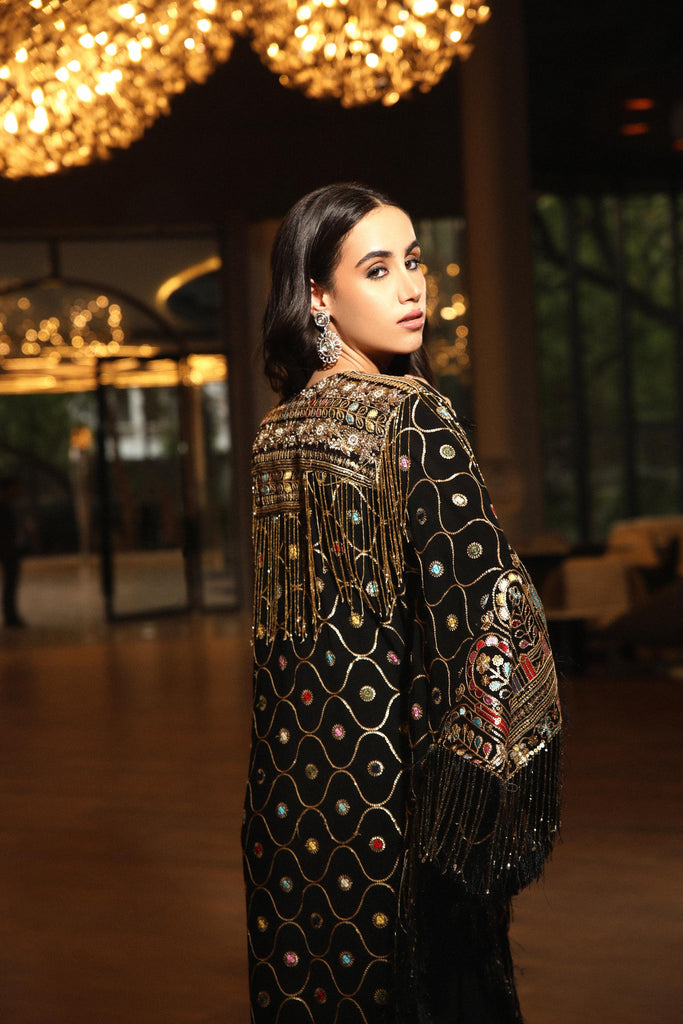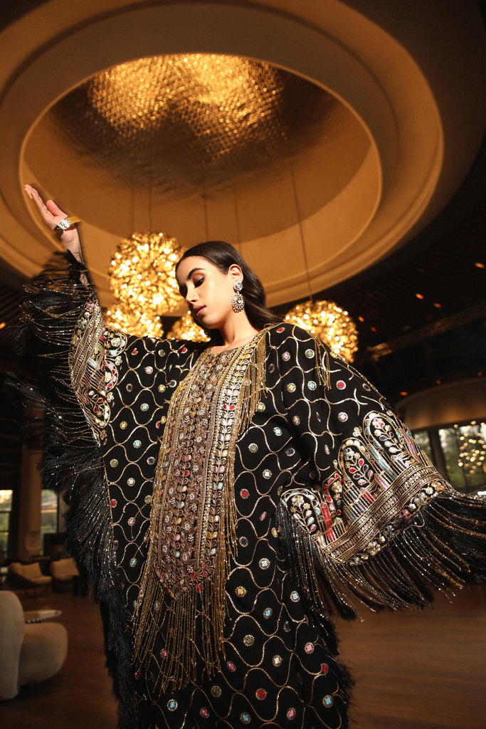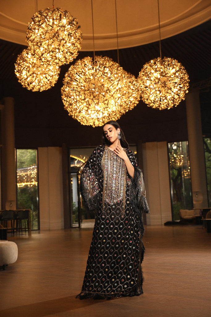 This one piece black all embroided kaftan is classic and versatile color that adds sophistication and drama to any outfit. It's often favored for formal wear and allows the intricate embroidery to stand out beautifully. The golden detailing of the embroidery and the golden tassels used at the outlining of the neck adds more glamour to this beautiful kaftan. This outfit is perfect for any formal function and allows the intricate embroidery to stand out beautifully.
