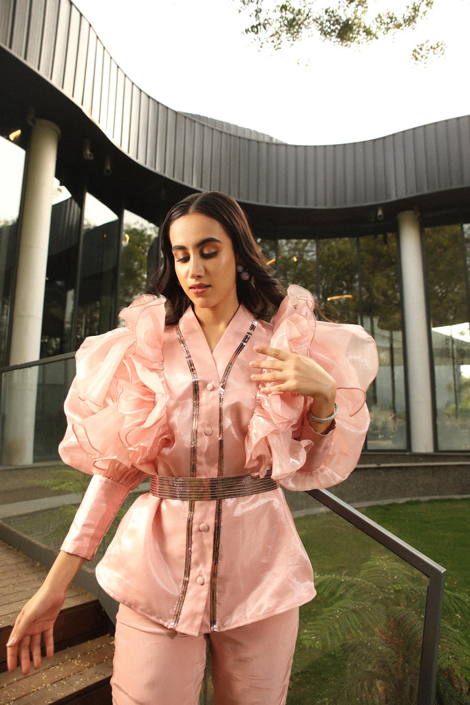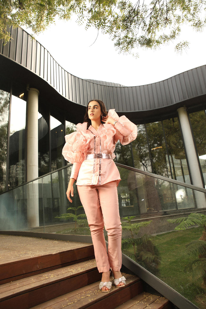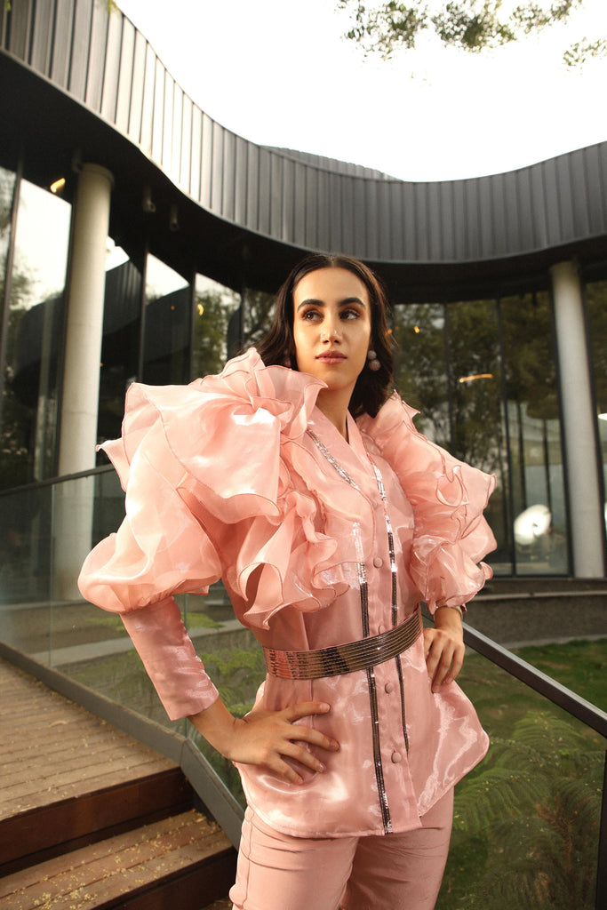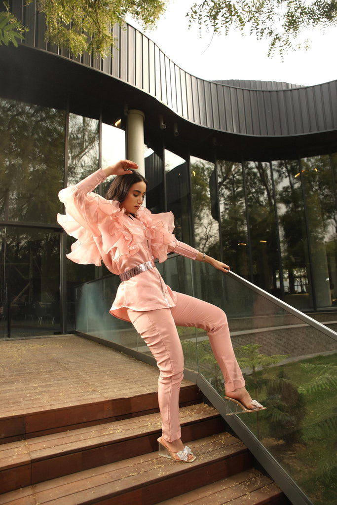 This 2 piece set comprises of a shirt, a metallic belt and straight pant. The combination of blush pink and metallic fabric creates a glamorous and eye-catching look, while the addition of ruffles adds a playful and feminine touch. The ruffle shirt and pants set offers a coordinated and polished appearance, perfect for various occasions where you want to make a statement with your outfit. The metallic belt serves as a stylish accent, adding definition to the waist.