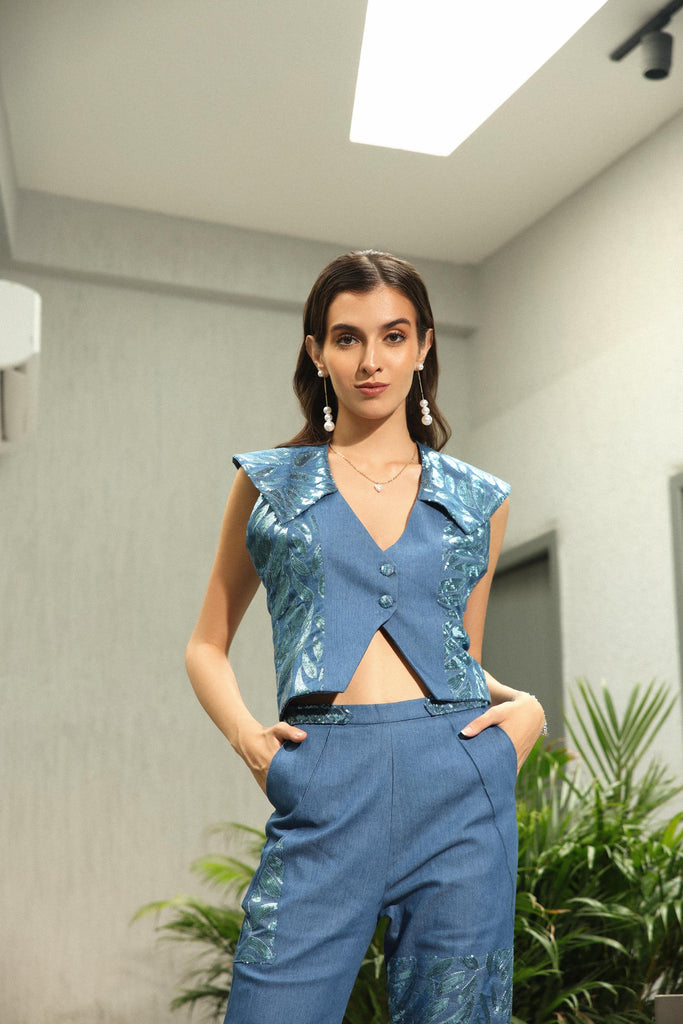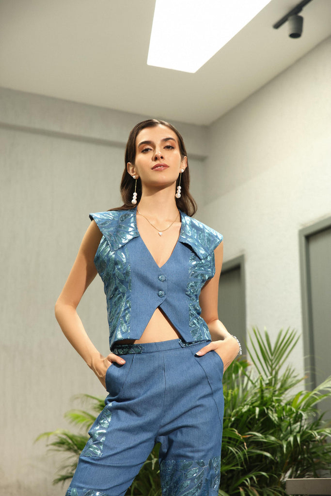 This denim co-ord set is a fun and glamorous twist on the exemplary denim look. he combination of denim with sequins adds a touch of sparkle and excitement to the outfit, making it perfect for special occasions or nights out where you want to make a statement. This set has a shoulder collar and is mid waist in length paired with high waisted flared pants.